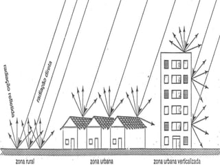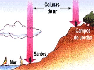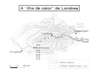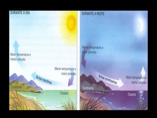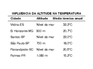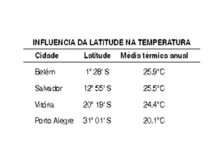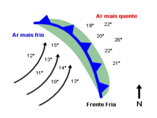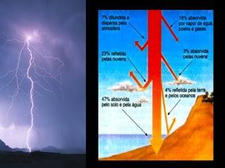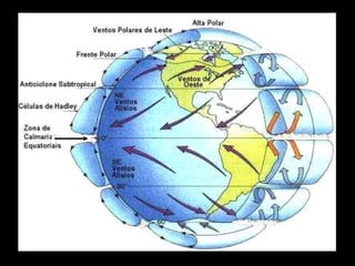 O documento discute os principais conceitos de meteorologia e climatologia, incluindo a estrutura da atmosfera, fatores que influenciam o clima como latitude e altitude, e processos atmosféricos como massas de ar, frentes frias, ventos e ciclos da água e do carbono.