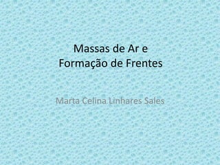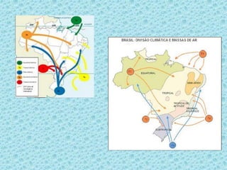O documento discute massas de ar e formação de frentes. Apresenta conceitos de massa de ar, origem e características de massas de ar que atuam no Brasil. Também discute as condições para formação de frentes, tipos de frentes como fria e quente, e suas características.