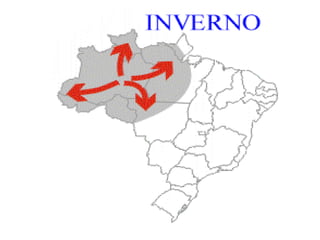 O documento discute as massas de ar que influenciam o clima brasileiro, incluindo a massa polar, que causa frio no sul do Brasil, a massa tropical continental, conhecida como bloqueio atmosférico, e as massas tropicais equatorial atlântica e continental, que trazem umidade para o nordeste e norte do Brasil.