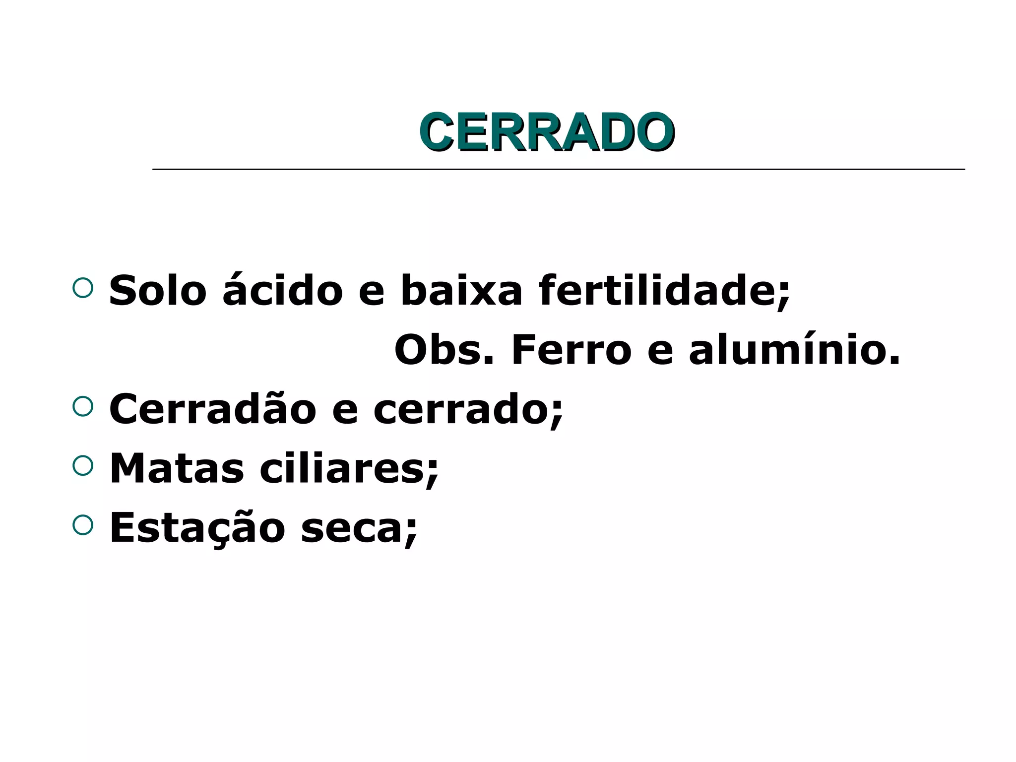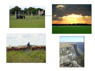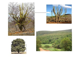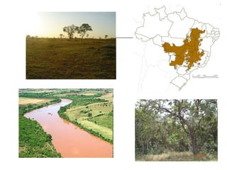 O documento descreve brevemente as principais regiões biogeográficas do Brasil, incluindo o Cerrado, Pantanal, Campos, Matas de Cocais, Caatinga, e Manguezais. Ele fornece detalhes sobre as características do solo, clima, flora e fauna de cada região.