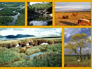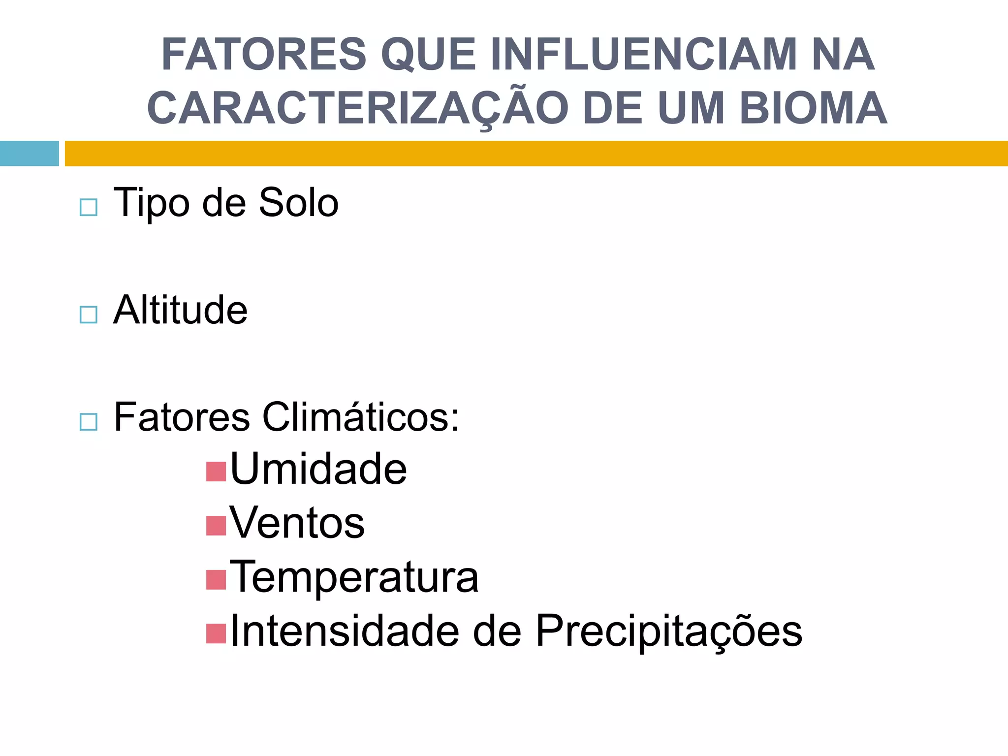 O documento discute os principais fatores que influenciam a caracterização de biomas, incluindo tipo de solo, altitude e fatores climáticos. Ele relaciona diferentes tipos de clima a seis biomas brasileiros - Amazônia, Caatinga, Mata Atlântica, Pantanal, Cerrado e Campos Sulinos - e descreve as características climáticas e problemas ambientais de cada um.
