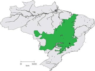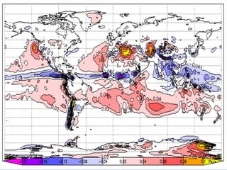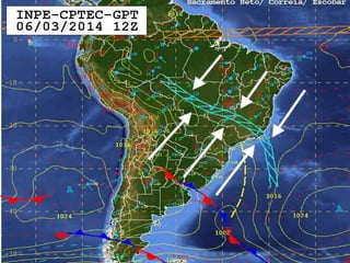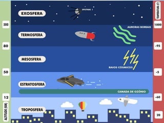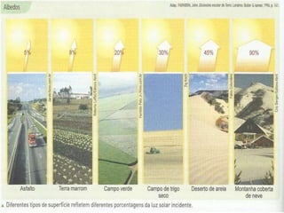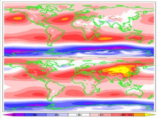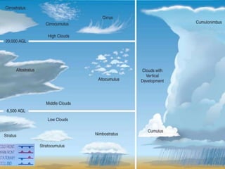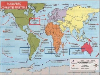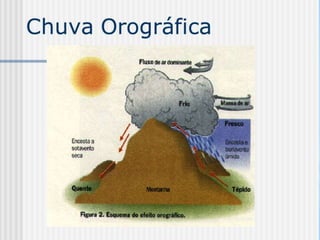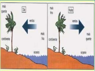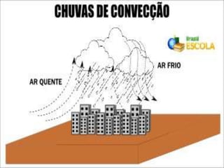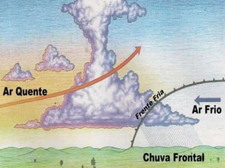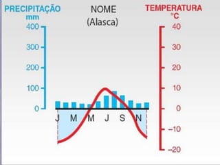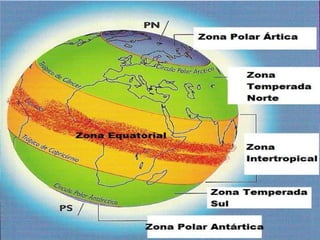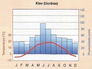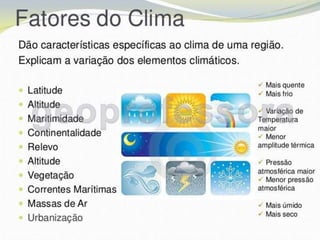 O documento descreve os principais elementos do clima e da vegetação, incluindo a atmosfera, as camadas atmosféricas, fatores climáticos, tipos de massas de ar, precipitação, nuvens e climas polares, temperados e mediterrâneo. Explica como a latitude, altitude, continentalidade, correntes oceânicas e outros fatores influenciam o clima e discute os principais tipos de nuvens e precipitação.