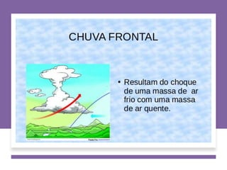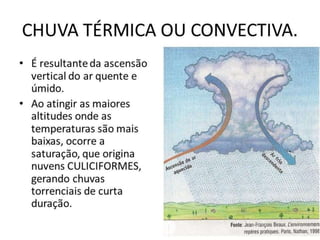 O documento discute os conceitos de clima e tempo, explicando que o tempo refere-se às condições atmosféricas em um momento, enquanto o clima é um padrão de longo prazo. Ele também descreve os fatores que influenciam o clima, como latitude, altitude, circulação atmosférica, continentalidade e vegetação. Além disso, fornece exemplos de tipos de chuva e ferramentas para medir o clima.