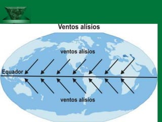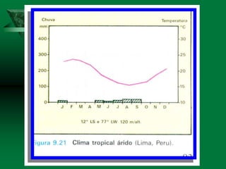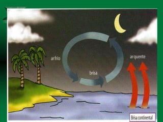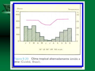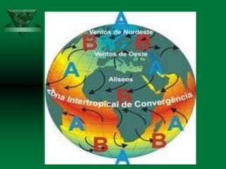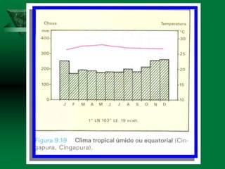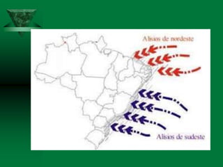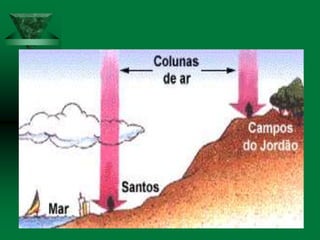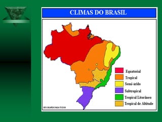 O documento discute os conceitos de clima e elementos climáticos. Ele explica que o clima é definido pela sucessão habitual do tempo em um local, enquanto o tempo refere-se às condições atmosféricas de um momento. O documento também descreve os principais fatores que influenciam o clima, como a temperatura, umidade, ventos, relevo e latitude.