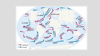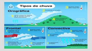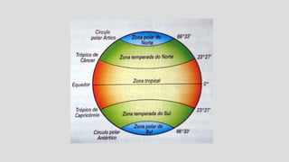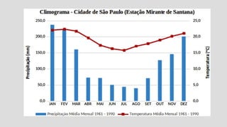 A climatologia estuda o clima e sua evolução histórica, dividindo-se em duas áreas principais: climatologia e meteorologia. O clima é definido como o comportamento da atmosfera ao longo de um longo período, enquanto o tempo refere-se a condições atmosféricas em um curto espaço de tempo. Fatores como latitude, correntes marítimas, maritimidade e massas de ar influenciam diversos tipos de climas encontrados ao redor do mundo.