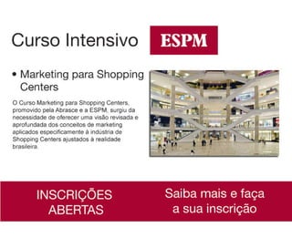 O documento discute as tendências do varejo brasileiro, incluindo a fusão entre as redes Ricardo Eletro e Insinuante para criar a Máquina de Vendas, a expansão planejada pelo Magazine Luiza para manter a segunda posição no setor e as perspectivas de crescimento para o setor de shoppings centers no Brasil.