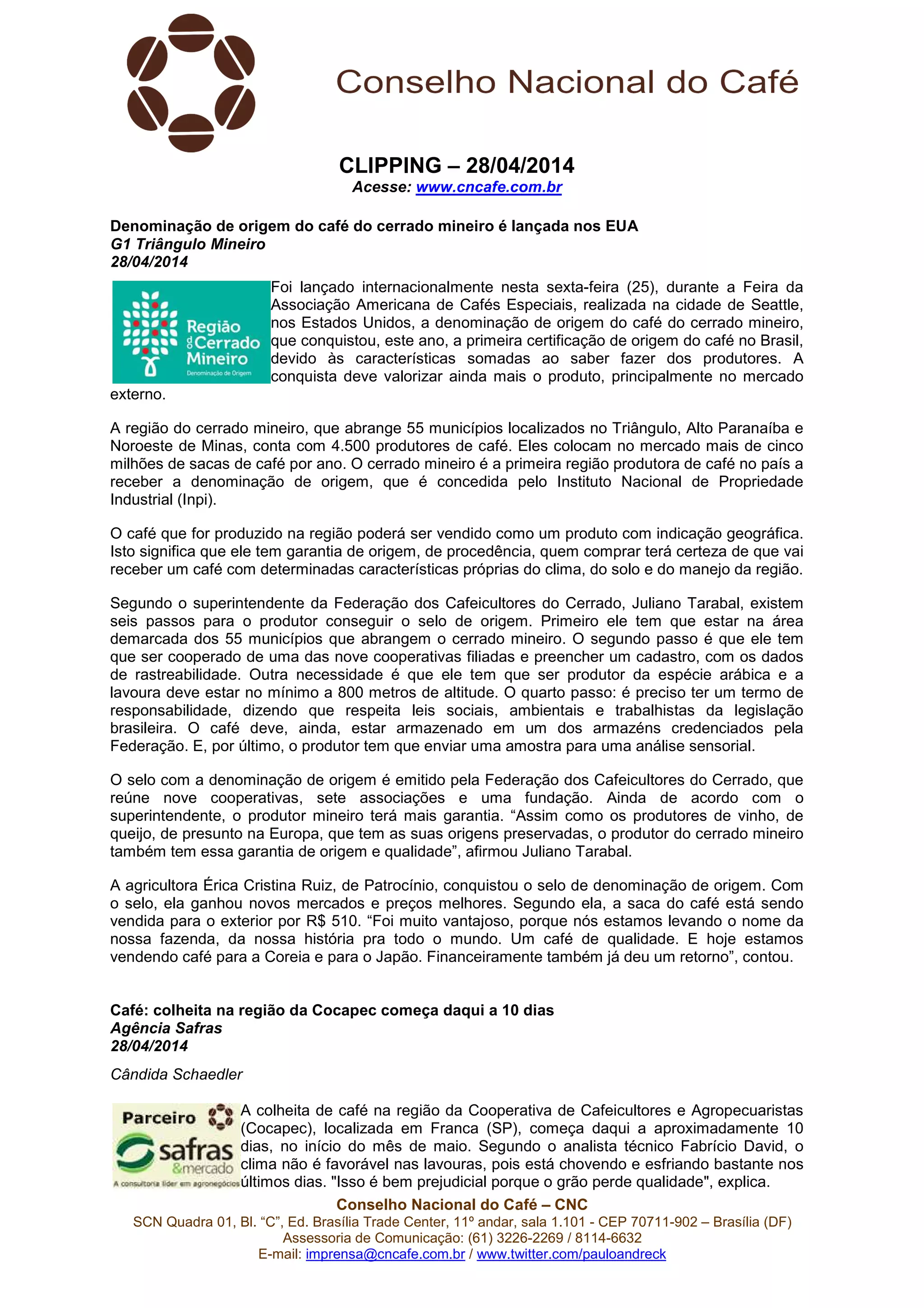 1) A denominação de origem do café do cerrado mineiro foi lançada nos EUA durante uma feira de cafés especiais em Seattle.