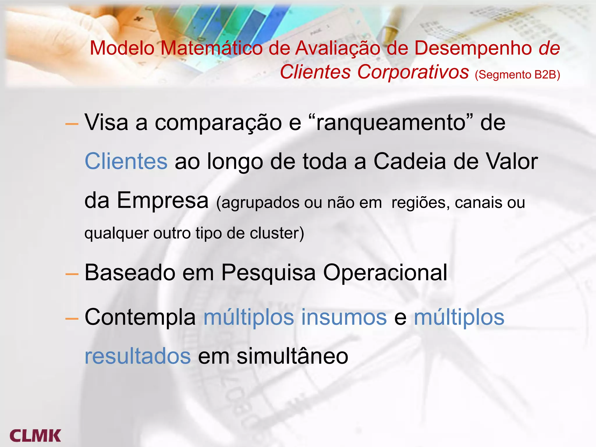 O documento descreve um modelo matemático para avaliar o desempenho de clientes corporativos considerando múltiplos fatores de entrada e saída. O modelo ranqueia os clientes e fornece recomendações para melhorar a produtividade considerando recursos utilizados versus resultados alcançados.
