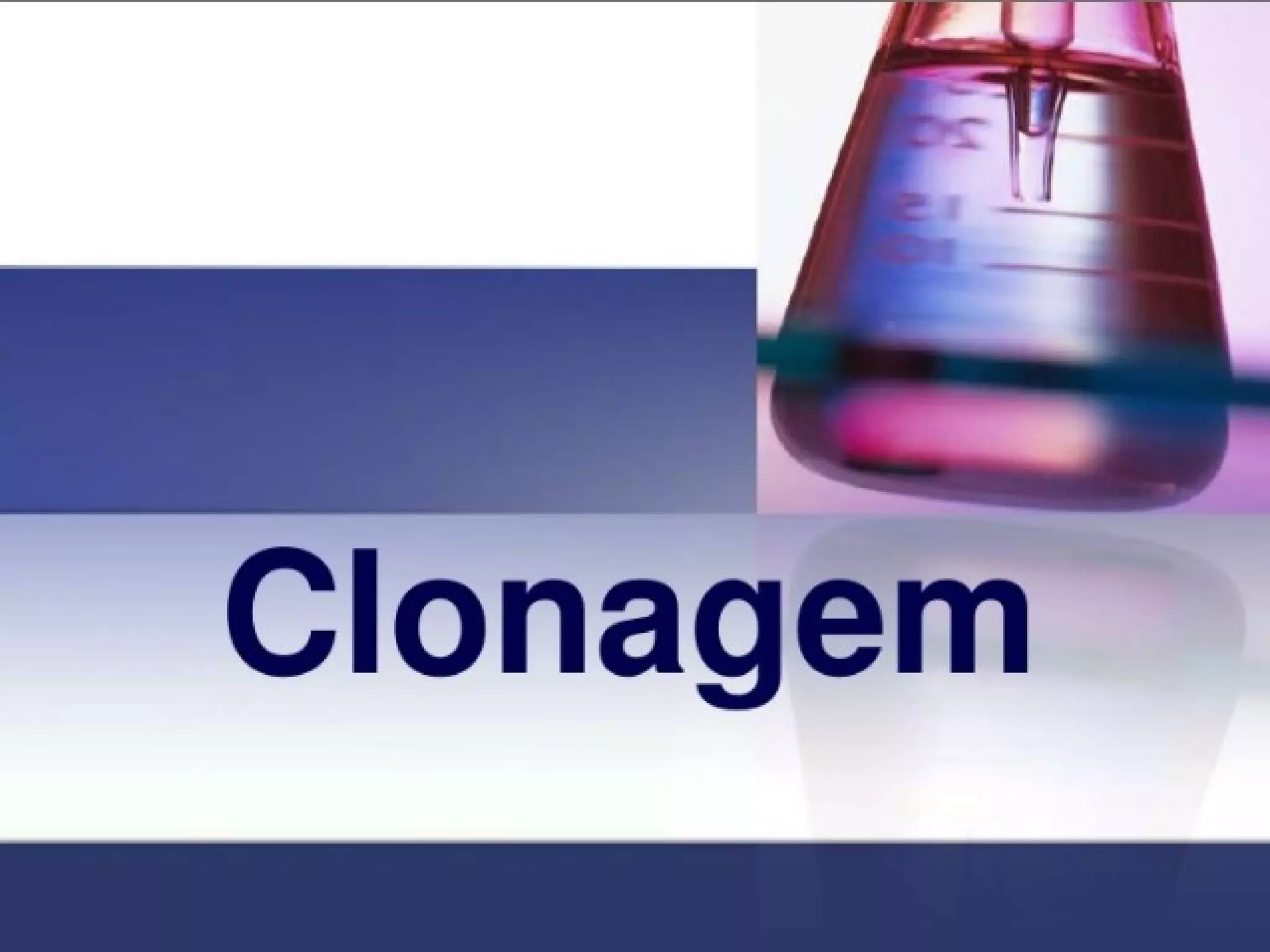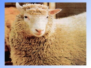 O documento discute a clonagem, definindo-a como o processo de produzir cópias geneticamente idênticas de um organismo. A primeira clonagem de um mamífero foi de Dolly a ovelha na Escócia em 1996. A clonagem pode ser usada para conservação de espécies ameaçadas e produção de animais transgênicos, enquanto a clonagem terapêutica tem como objetivo produzir tecidos e órgãos para transplante usando células-tronco.