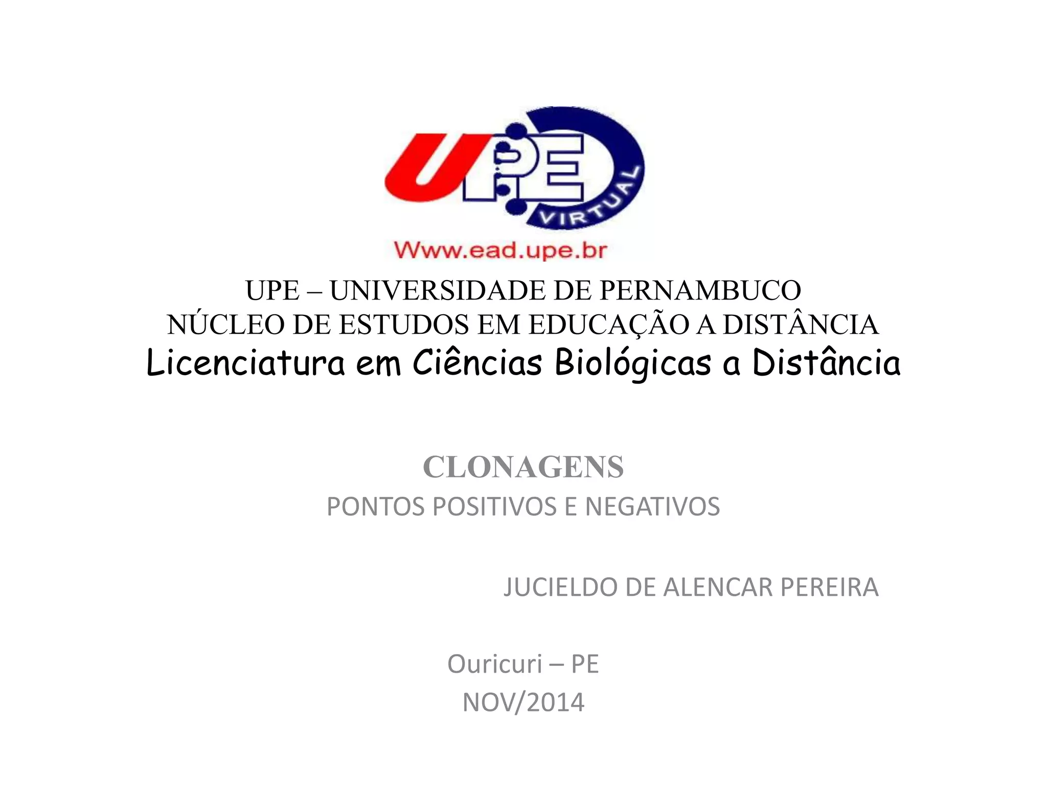 UPE – UNIVERSIDADEDE PERNAMBUCO NÚCLEO DE ESTUDOS EM EDUCAÇÃO A DISTÂNCIA Licenciatura em Ciências Biológicas a Distância CLONAGENS PONTOS POSITIVOS E NEGATIVOS JUCIELDO DE ALENCAR PEREIRA Ouricuri – PE NOV/2014