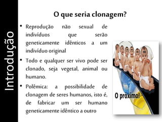 O documento discute o tema da clonagem, definindo-a como a reprodução não sexual de indivíduos geneticamente idênticos. Aborda a clonagem terapêutica para transplantes e a polêmica em torno da clonagem humana. Também explica as diferenças entre células-tronco embrionárias e adultas e discute os aspectos éticos, teológicos e legais envolvidos na clonagem.
