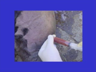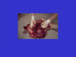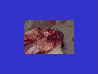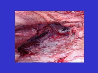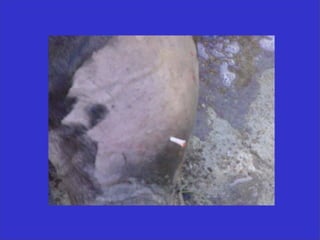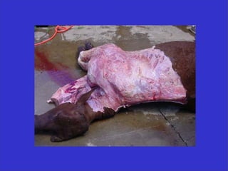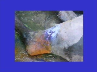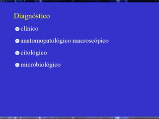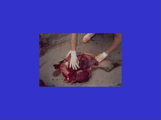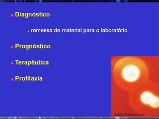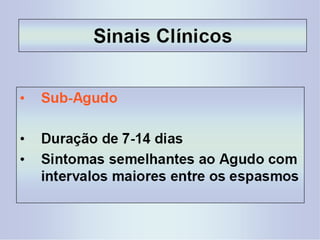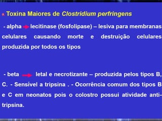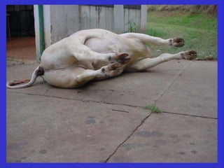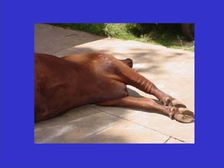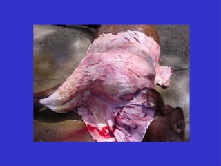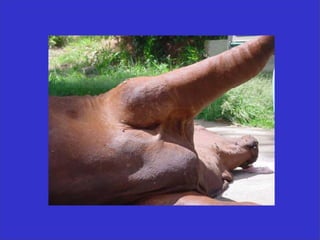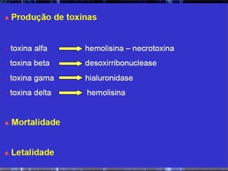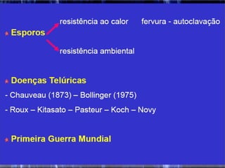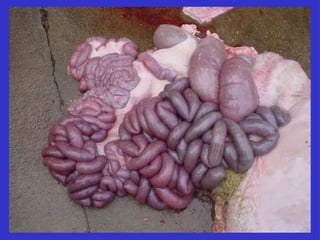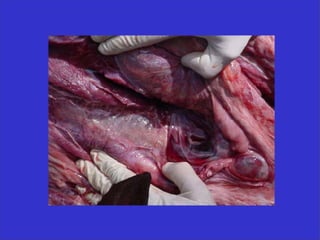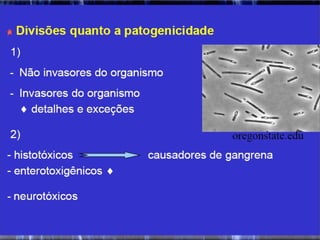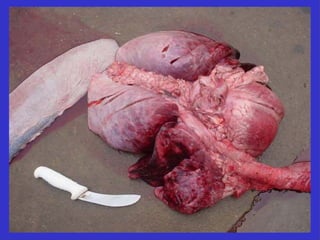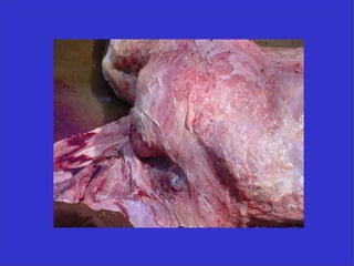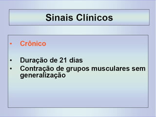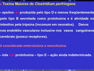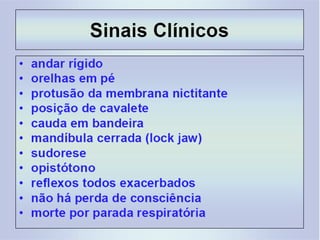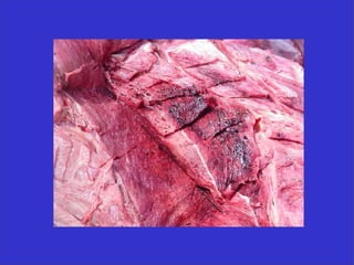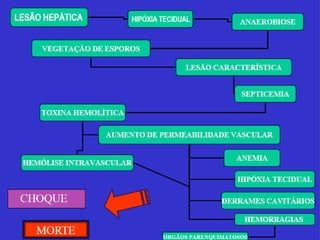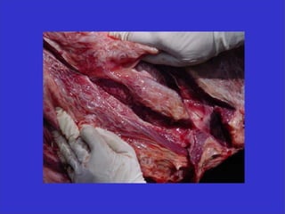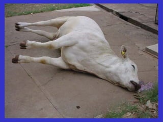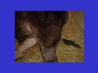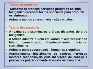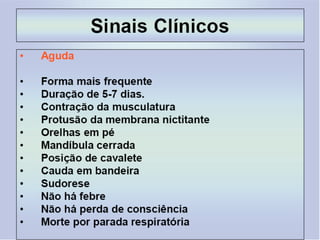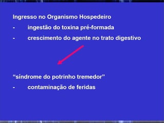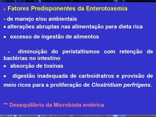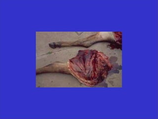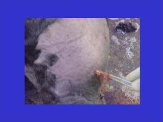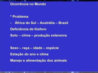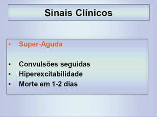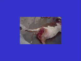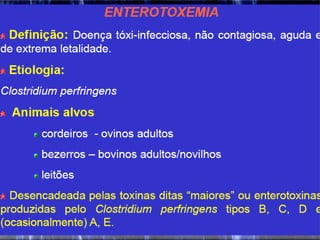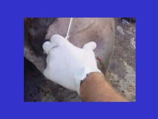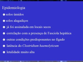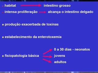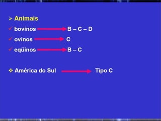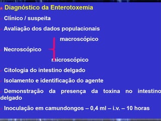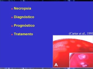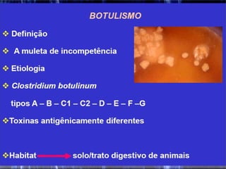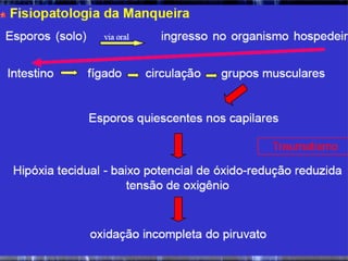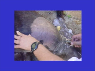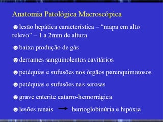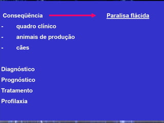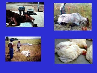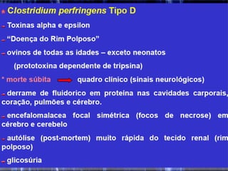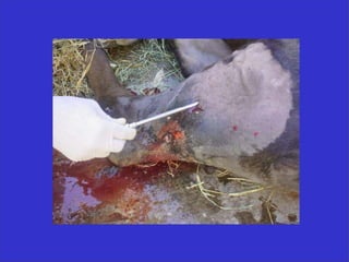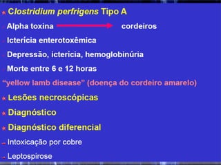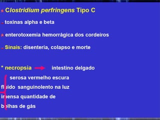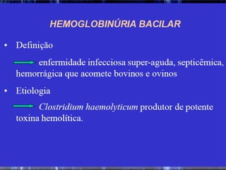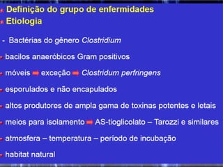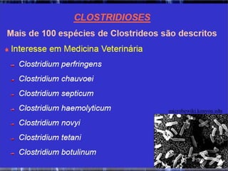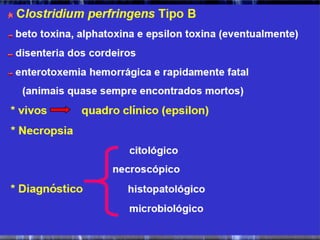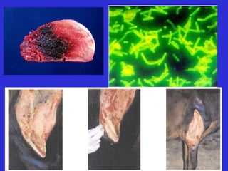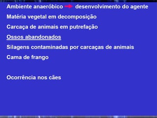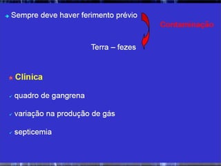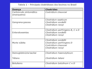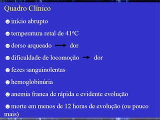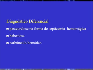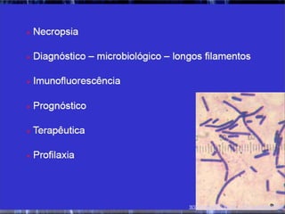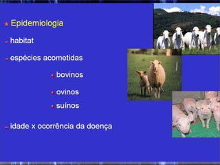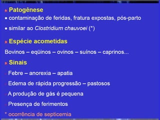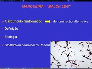 O documento discute o carbúnculo sintomático em bovinos, causado pela bactéria Clostridium chauvoei. Os sinais clínicos incluem lesões musculares, edema e crepitação. O diagnóstico é feito através de anamnese, sinais clínicos, necropsia e isolamento da bactéria. A prevenção envolve vacinação e transferência de animais para longe de áreas contaminadas.