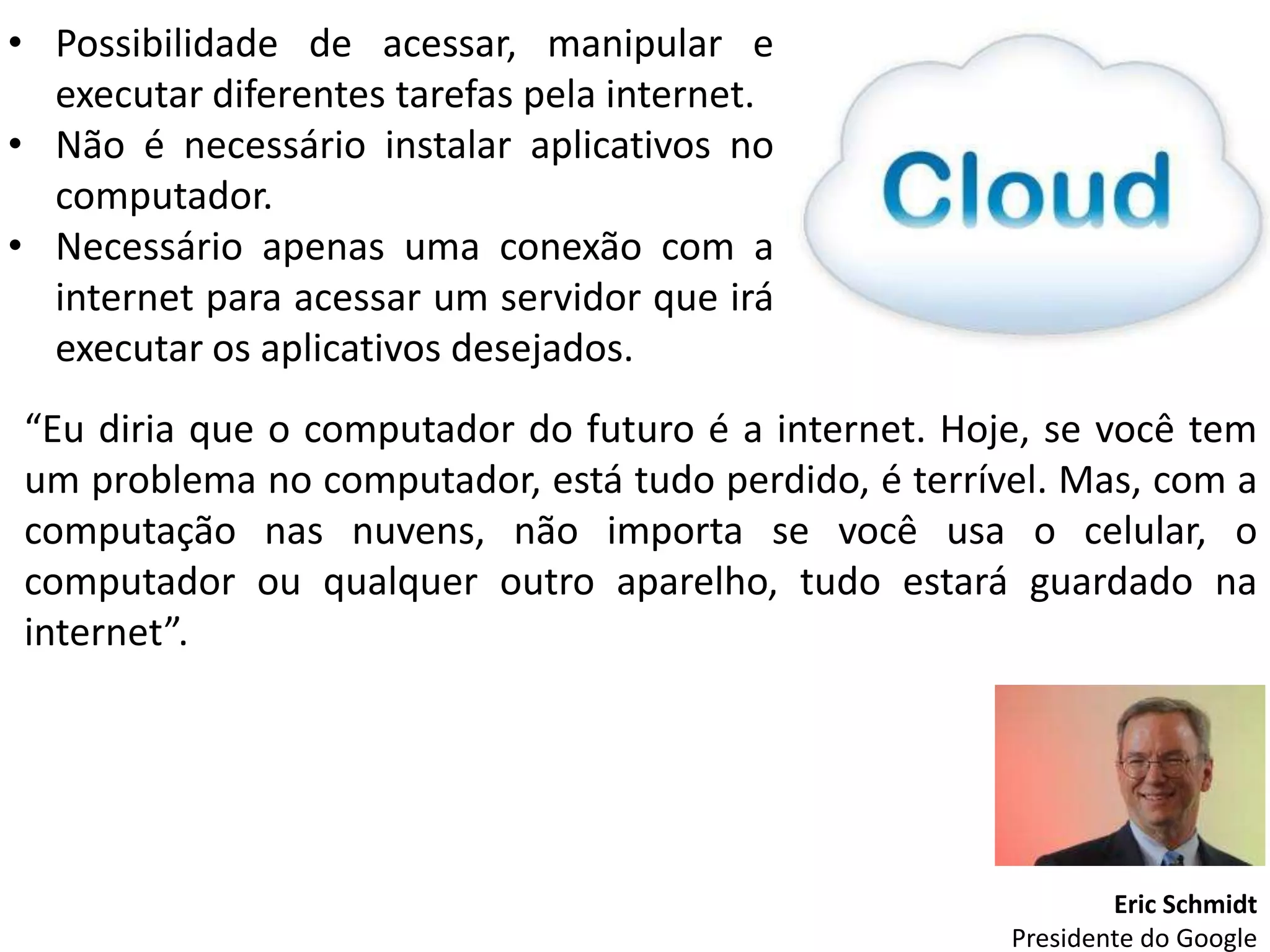 O documento discute os conceitos e características da computação em nuvem, incluindo: (1) a possibilidade de acessar aplicativos pela internet sem instalá-los localmente, (2) o armazenamento de dados em servidores remotos ao invés de dispositivos locais, e (3) a necessidade apenas de conexão com a internet para acessar recursos computacionais.