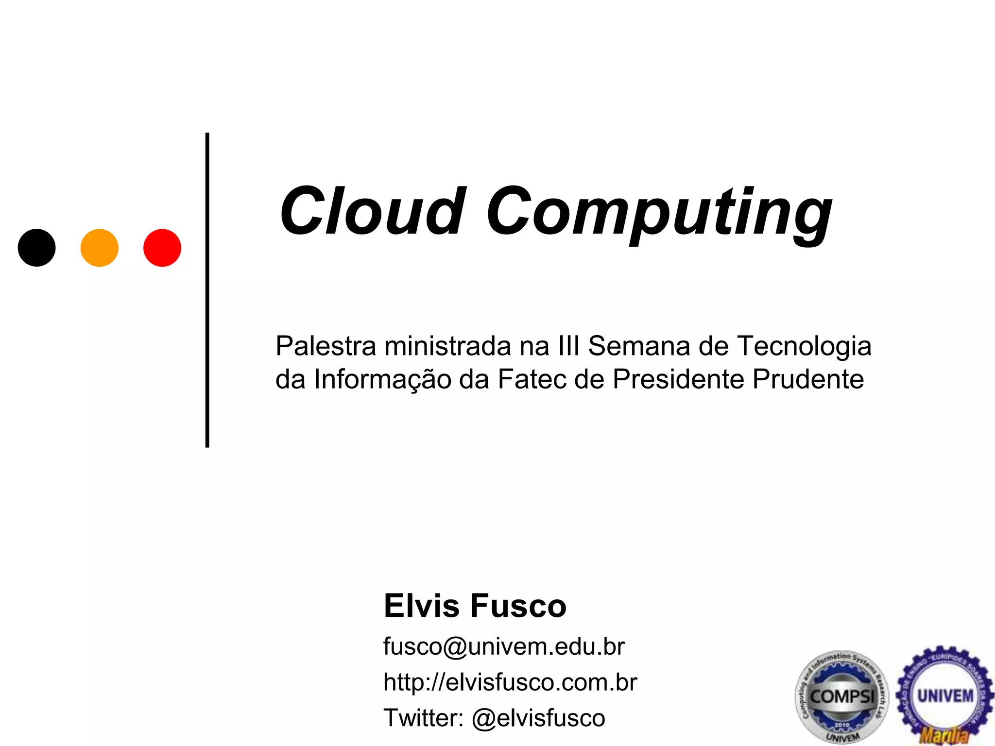 O documento apresenta uma palestra sobre Cloud Computing ministrada por Elvis Fusco. A palestra discute os problemas com infraestrutura de TI tradicional, introduz o conceito de Cloud Computing e seus modelos (IaaS, PaaS, SaaS), apresenta exemplos de plataformas e discute as vantagens e desvantagens dessa abordagem.