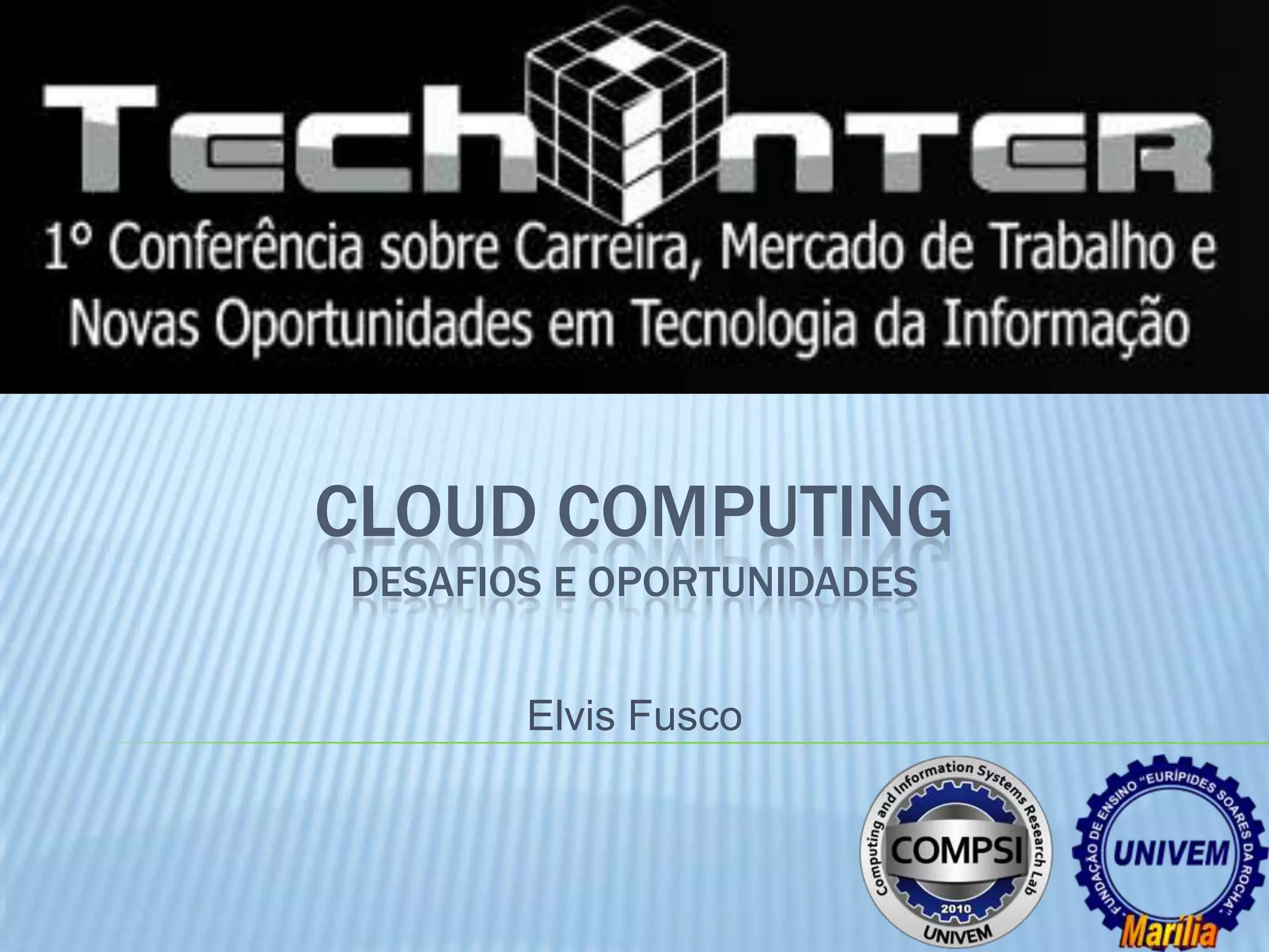 O documento discute os desafios e oportunidades do cloud computing. Ele explica como o cloud computing pode reduzir os custos de infraestrutura TI para empresas, especialmente pequenas e médias. Também descreve as principais categorias de serviços na nuvem (IaaS, PaaS, SaaS, DBaaS) e discute questões como segurança, governança e integração de sistemas legados com sistemas na nuvem.