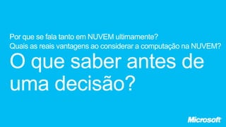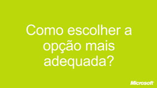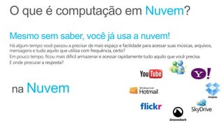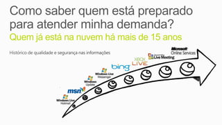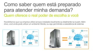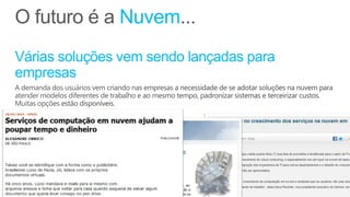 O documento apresenta os principais serviços e recursos do Microsoft Office 365, incluindo ferramentas de colaboração e produtividade baseadas na nuvem, armazenamento e suporte online 24/7. Ele destaca os benefícios do Office 365 para pequenas empresas, como acesso em qualquer dispositivo, integração com ferramentas familiares e segurança aprimorada.