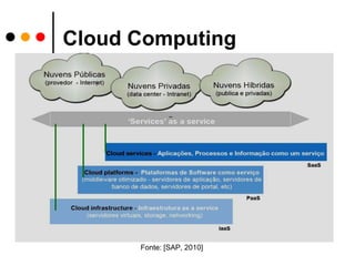 A palestra ministrada por Elvis Fusco aborda o conceito de computação em nuvem, destacando suas vantagens, como elasticidade, agilidade, e redução de custos, além de discutir problemas enfrentados por empresas, principalmente pequenas e médias, com infraestrutura tradicional de TI. O modelo de cloud computing proporciona serviços sob demanda e sem a necessidade de instalação local, representando uma evolução significativa na forma de gerenciamento de recursos de TI. O documento também detalha classificações e tipos de nuvens, assim como exemplos de plataformas que utilizam essa tecnologia.