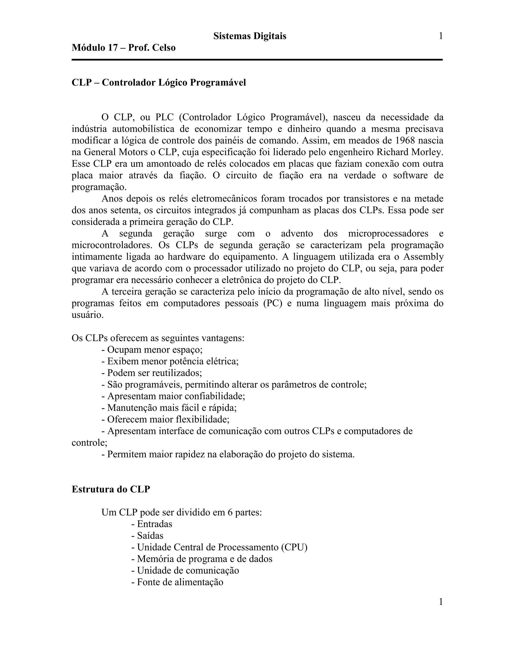 O documento descreve os principais componentes e funcionalidades de um controlador lógico programável (CLP), incluindo sua estrutura, linguagens de programação, e como funciona para controlar sistemas industriais lendo entradas e acionando saídas.
