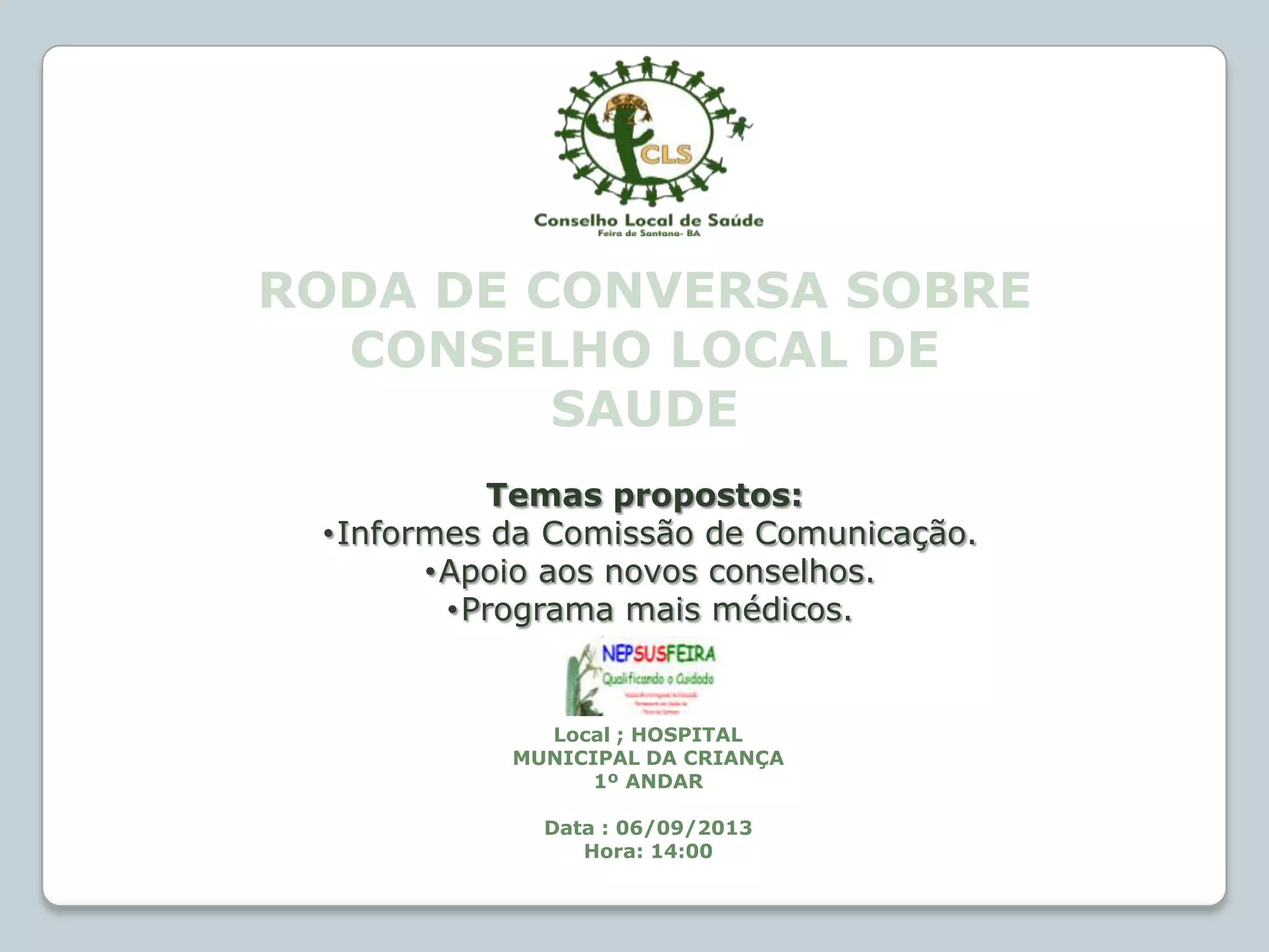 A reunião irá discutir informes da comissão de comunicação, apoio aos novos conselhos e o programa mais médicos no Hospital Municipal da Criança em 06/09/2013 às 14:00.