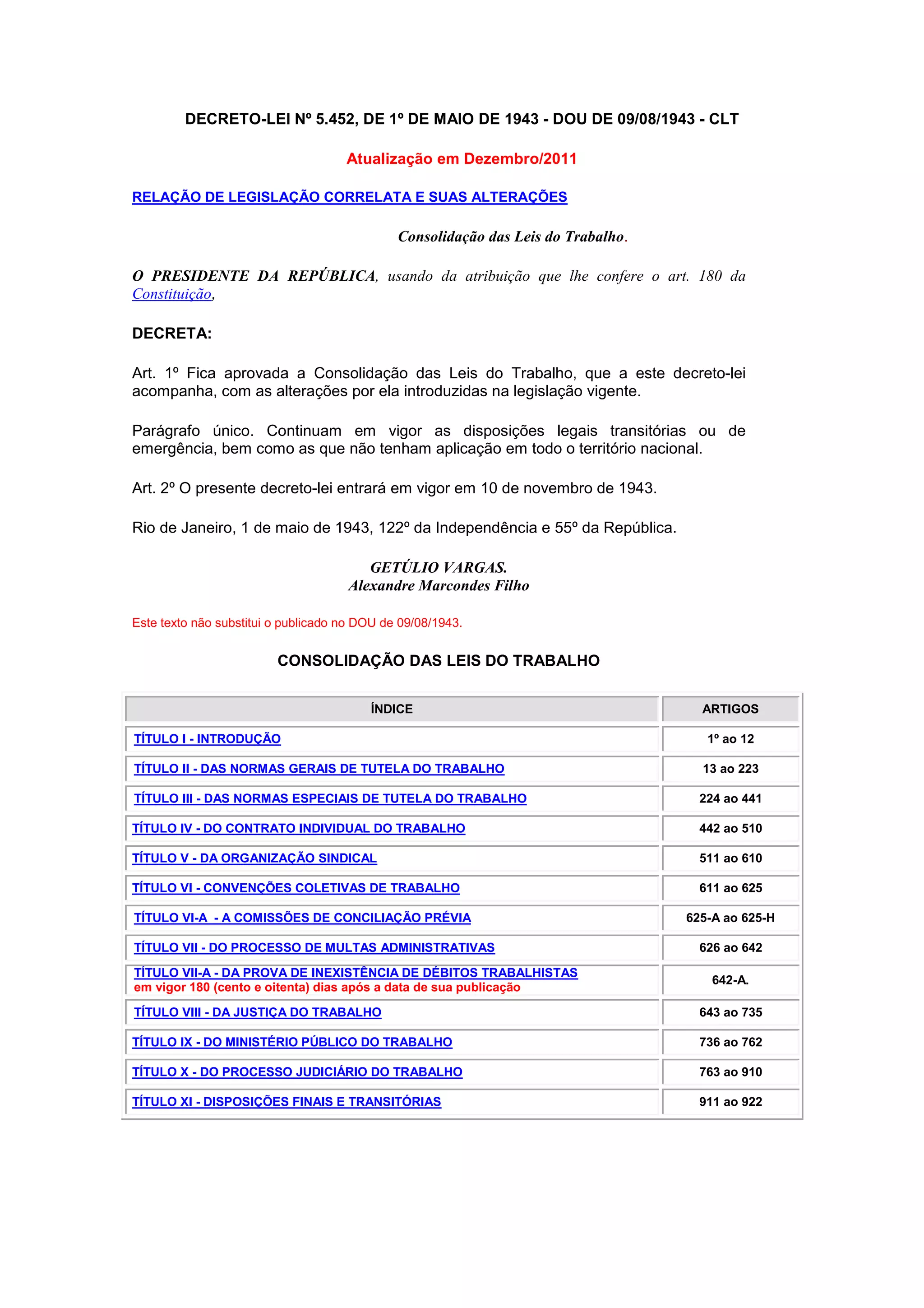 Este documento aprova a Consolidação das Leis do Trabalho (CLT), que consolida as leis trabalhistas vigentes no Brasil em um único texto legal. A CLT estabelece normas gerais e especiais de proteção ao trabalho, regras sobre contratos de trabalho, organizações sindicais, convenções coletivas e processos trabalhistas.