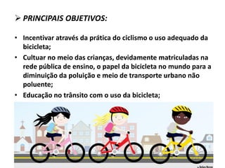 O documento descreve as 5 fases de um projeto para o Clube Educacional da Bicicleta, com o objetivo de educar crianças através da prática do ciclismo. A primeira fase é a criação do clube. A segunda fase é o desenvolvimento de modalidades do ciclismo. A terceira fase envolve competições entre os alunos. A quarta fase é a formação de uma equipe escolar. E a quinta fase é levar os alunos talentosos ao alto rendimento no ciclismo.