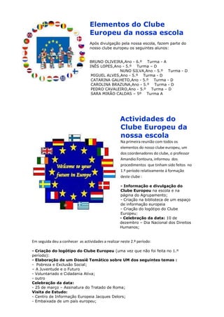 O documento descreve um clube europeu em uma escola. O clube tem como objetivos promover a cidadania europeia, educar sobre a história, cultura e instituições da Europa, e encorajar a cooperação e responsabilidade social entre os estudantes. O documento lista as atividades planejadas para o segundo período, incluindo a criação de um logotipo, dossiês temáticos, e uma visita de estudo.