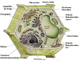 O documento descreve as características e funções das células e de seus principais organelos. Resume que células podem ser unicelulares como protozoários e bactérias ou pluricelulares como animais, plantas e fungos. Detalha também as três partes básicas da célula - membrana, citoplasma e núcleo - e funções de organelos como mitocôndrias, complexo de Golgi, retículo endoplasmático e centríolos.