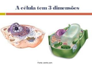 O documento descreve as principais características das células animais e vegetais. Ele explica que as células vegetais possuem uma parede celular, cloroplastos e forma alongada, enquanto as células animais são arredondadas e não possuem parede celular ou cloroplastos. Ambos os tipos de célula compartilham membrana, citoplasma e núcleo.