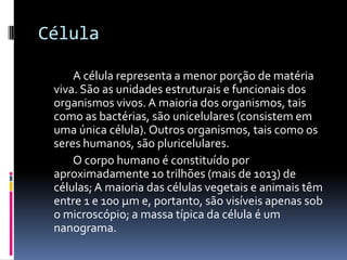 O documento discute as características das células procarióticas e eucarióticas, incluindo suas estruturas e diferenças. Também explica o processo de diferenciação celular, no qual as células se especializam para funções específicas, e como as células podem se agrupar em tecidos e órgãos.