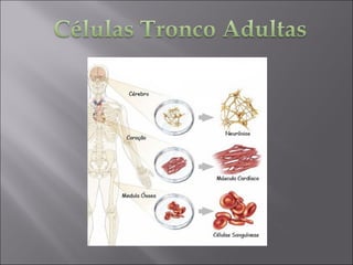 O documento discute células-tronco embrionárias e adultas, explicando o que são, para que servem e como são obtidas. Também aborda os principais pontos de debate sobre o uso de células-tronco embrionárias, incluindo vantagens, desvantagens e a polêmica envolvendo a destruição do embrião.
