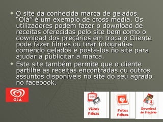 Crossmedia refere-se à distribuição de conteúdos através de múltiplas plataformas para envolver os consumidores. O site da marca de gelados "Olá" é um exemplo, permitindo aos utilizadores partilhar receitas e fotos comendo gelados em troca de prémios, ajudando a promover a marca através do envolvimento dos consumidores. O site da submarca Cornetto permite aos utilizadores criar convites virtuais para encontros ideais.