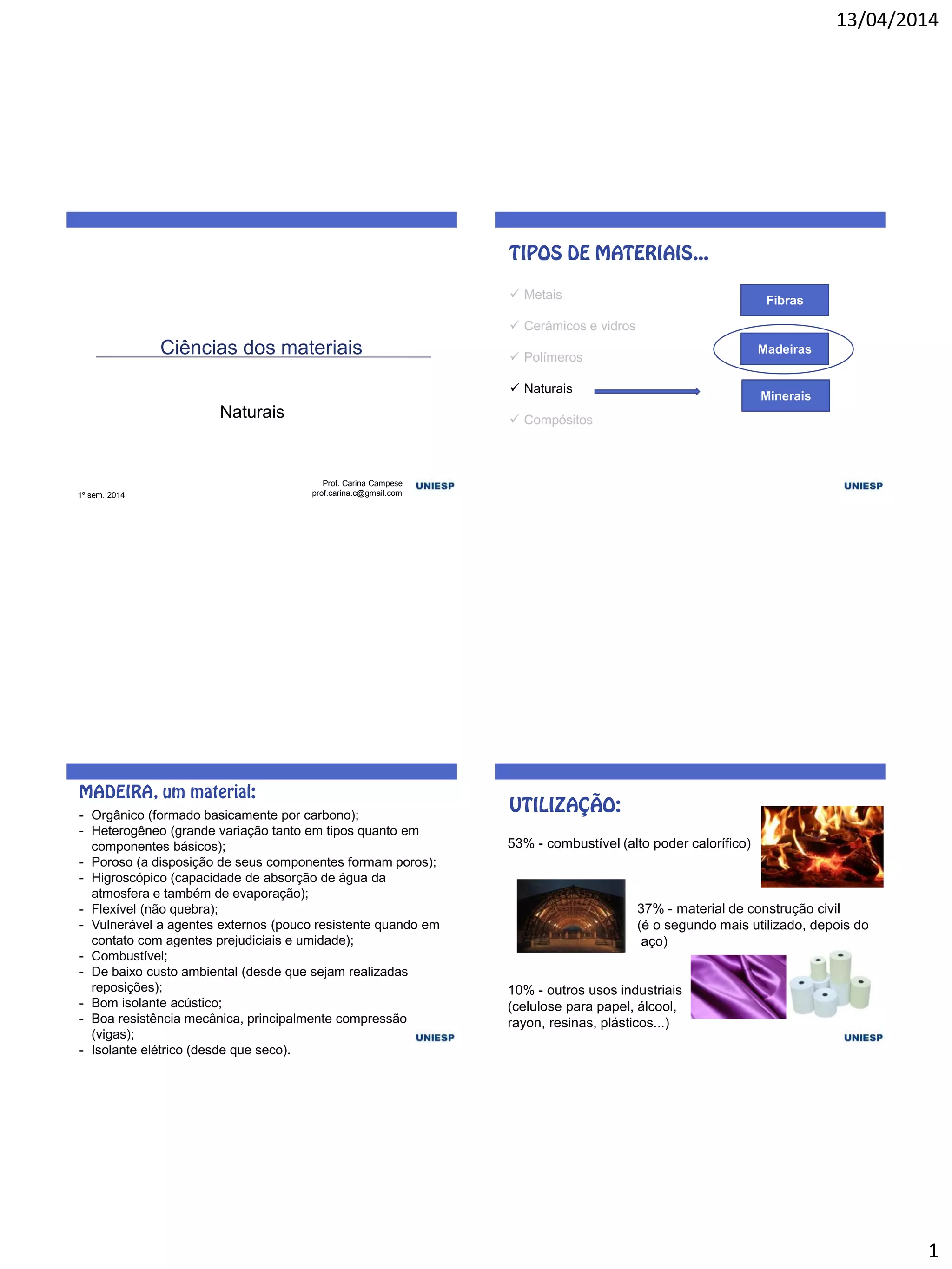 O documento discute as propriedades e usos da madeira. Ele descreve as características de diferentes tipos de madeira, como sua estrutura, densidade e reação à umidade. Também explica como a madeira é processada e usada em produtos como compensados, aglomerados e fibras.