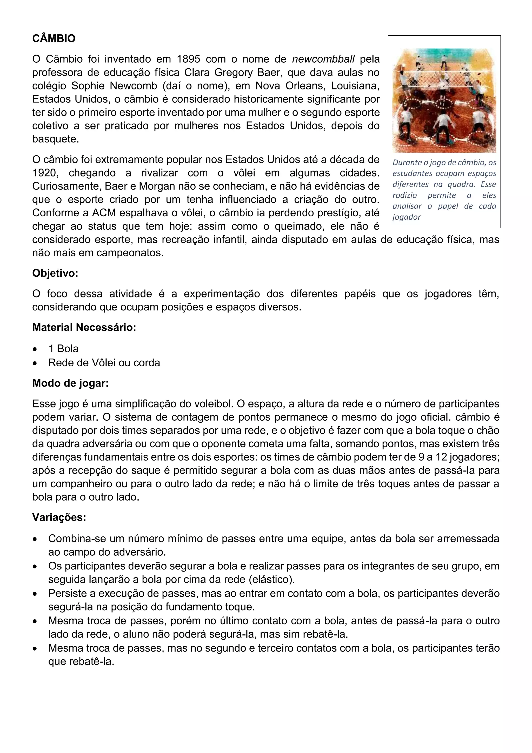 O câmbio foi inventado em 1895 por Clara Gregory Baer como o primeiro esporte inventado por uma mulher. Foi extremamente popular nos EUA até a década de 1920, mas perdeu prestígio com a ascensão do vôlei. Atualmente é considerado uma recreação infantil em vez de um esporte competitivo.