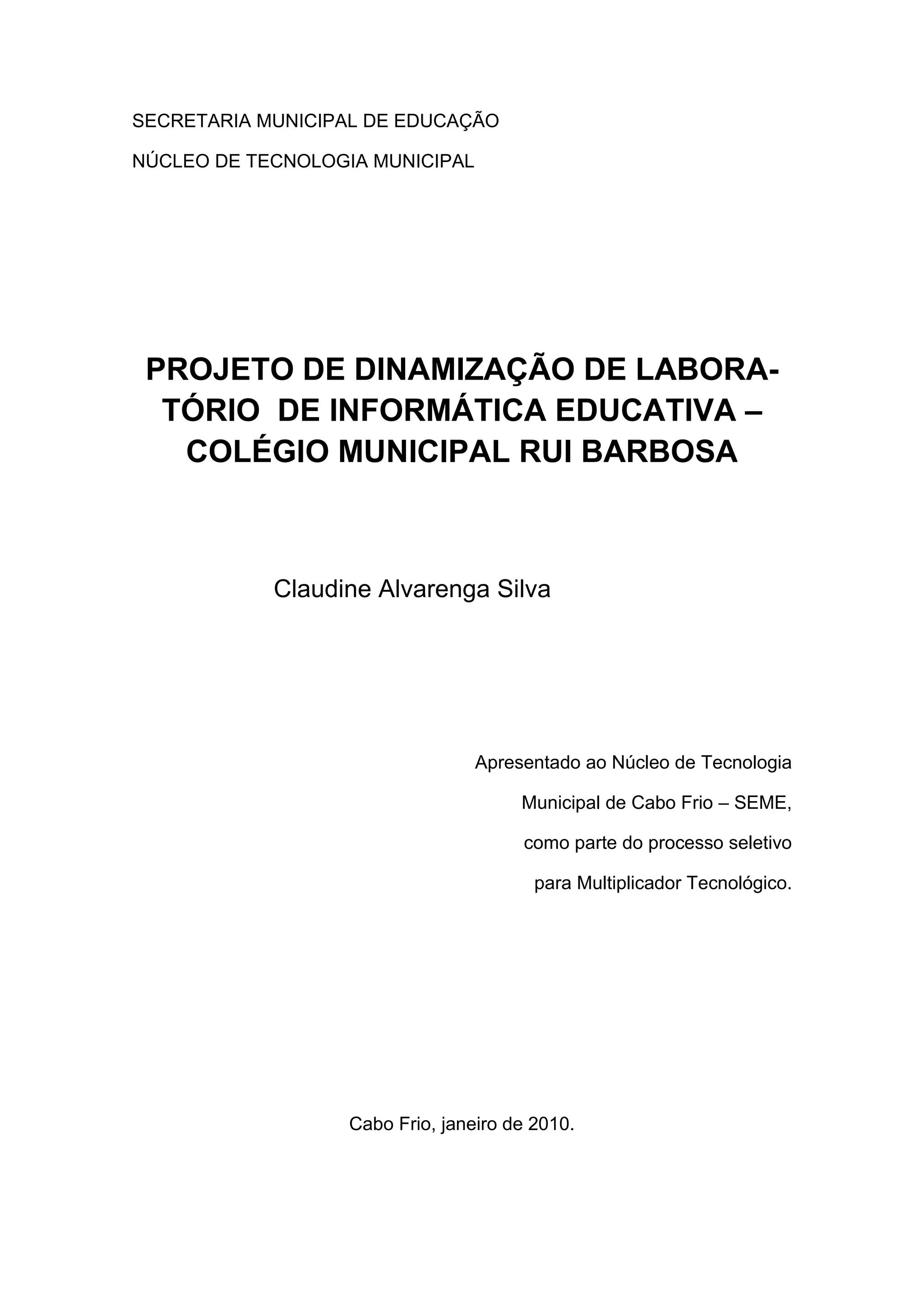 O documento apresenta um projeto para dinamizar o laboratório de informática educativa do Colégio Municipal Rui Barbosa em Cabo Frio. O projeto visa promover o uso pedagógico das tecnologias digitais na escola para aproximar os estudos dos alunos do mundo real e prepará-los para a vida e o mercado de trabalho. O projeto também busca capacitar os professores para utilizarem melhor os recursos tecnológicos em suas aulas de forma a envolver mais os estudantes nos conteúdos.