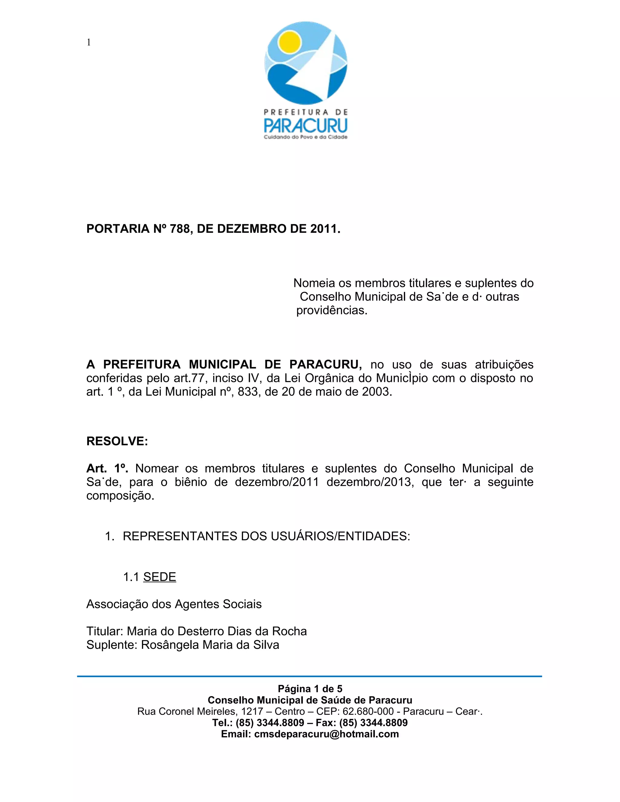A portaria nomeia os membros titulares e suplentes do Conselho Municipal de Saúde de Paracuru para o biênio de 2011-2013, listando os representantes de usuários, sindicatos, profissionais de saúde, prestadores de serviço e gestores.