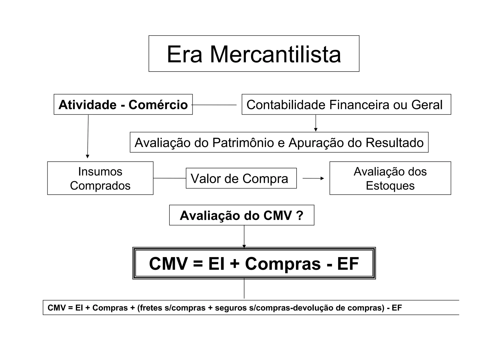 O documento descreve a evolução da contabilidade ao longo da era mercantilista e industrial, com foco na avaliação de estoques e apuração de custos. Na era mercantilista, a contabilidade se concentrava na avaliação patrimonial e resultado. Na era industrial, surgiu a contabilidade de custos para acompanhar a produção fabril. O documento também fornece exemplos de cálculo de custos de produção e determinação do lucro bruto.