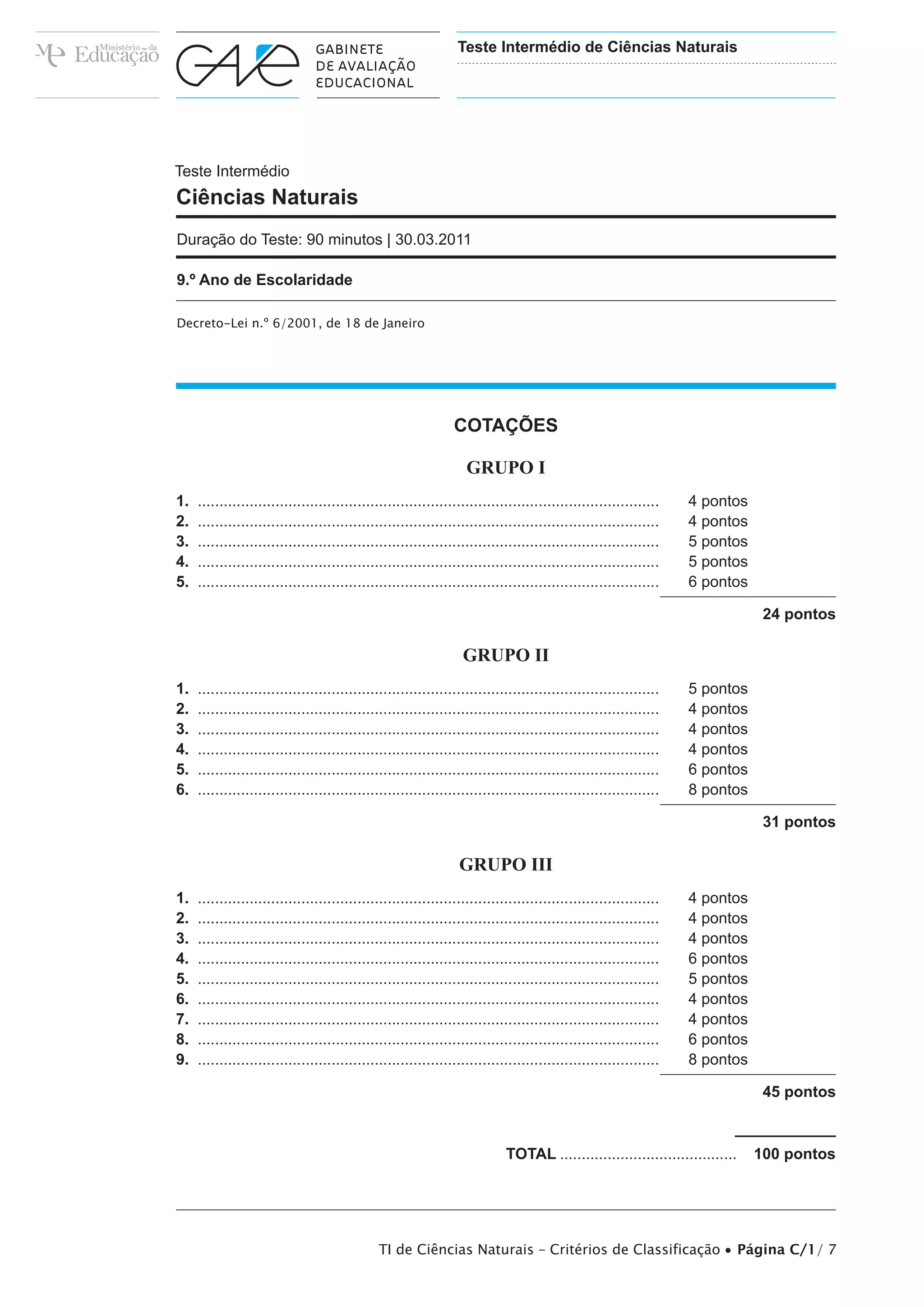 Este documento fornece as instruções e critérios de classificação para um teste de Ciências Naturais para alunos do 9o ano. O teste contém três grupos de questões e critérios específicos para pontuar cada resposta. O documento detalha como os alunos serão classificados de acordo com seu desempenho em cada questão.