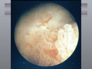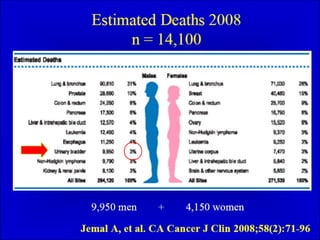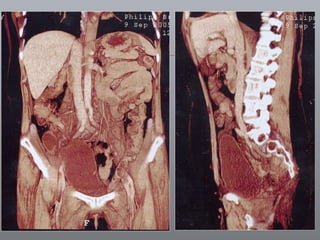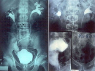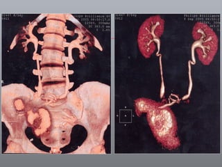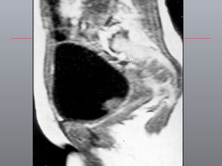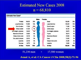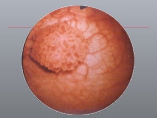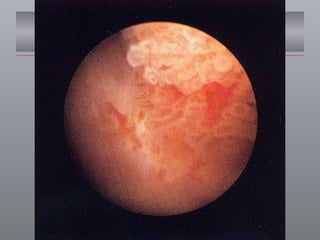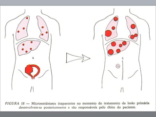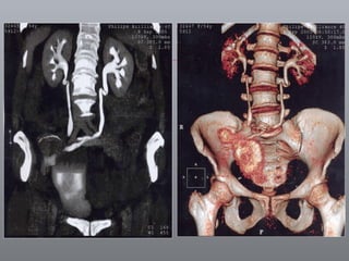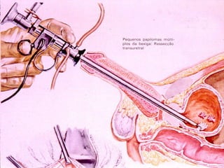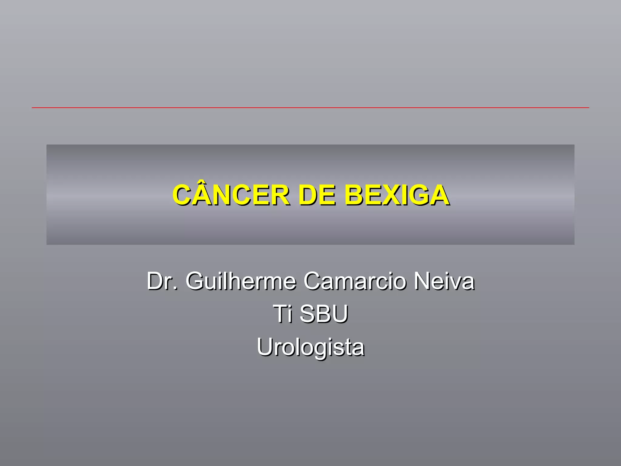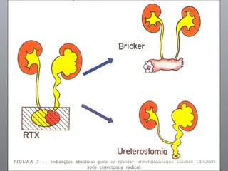 O documento discute o câncer de bexiga, incluindo sua epidemiologia, fatores de risco, métodos de detecção, manifestações clínicas, estudos de imagem para diagnóstico e estadiamento, opções de tratamento cirúrgico e derivações urinárias pós-cistectomia.