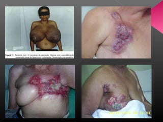 O documento discute o câncer de mama, incluindo sua definição, fatores de risco, sintomas e tipos. É o tumor maligno mais comum em mulheres e sua incidência tem aumentado nas últimas décadas. Existem diferentes tipos de câncer de mama que variam em agressividade e resposta a tratamentos. A detecção precoce por meio de exames clínicos e mamografia é importante para um melhor prognóstico.