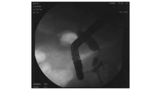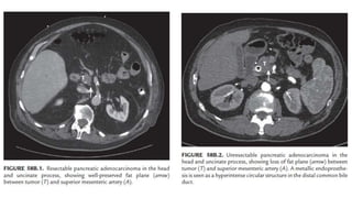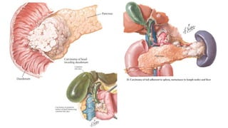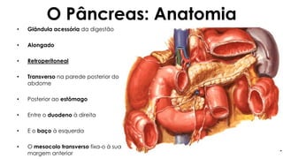 O documento descreve a anatomia, fatores de risco, sinais e sintomas, diagnóstico e estadiamento do adenocarcinoma de pâncreas. O pâncreas está localizado no abdome retroperitoneal entre o estômago e o duodeno. Os principais fatores de risco incluem idade avançada, tabagismo e história familiar. Os sintomas como dor, perda de peso e icterícia geralmente ocorrem em estágios avançados da doença. A TC e marcadores tumorais como CA