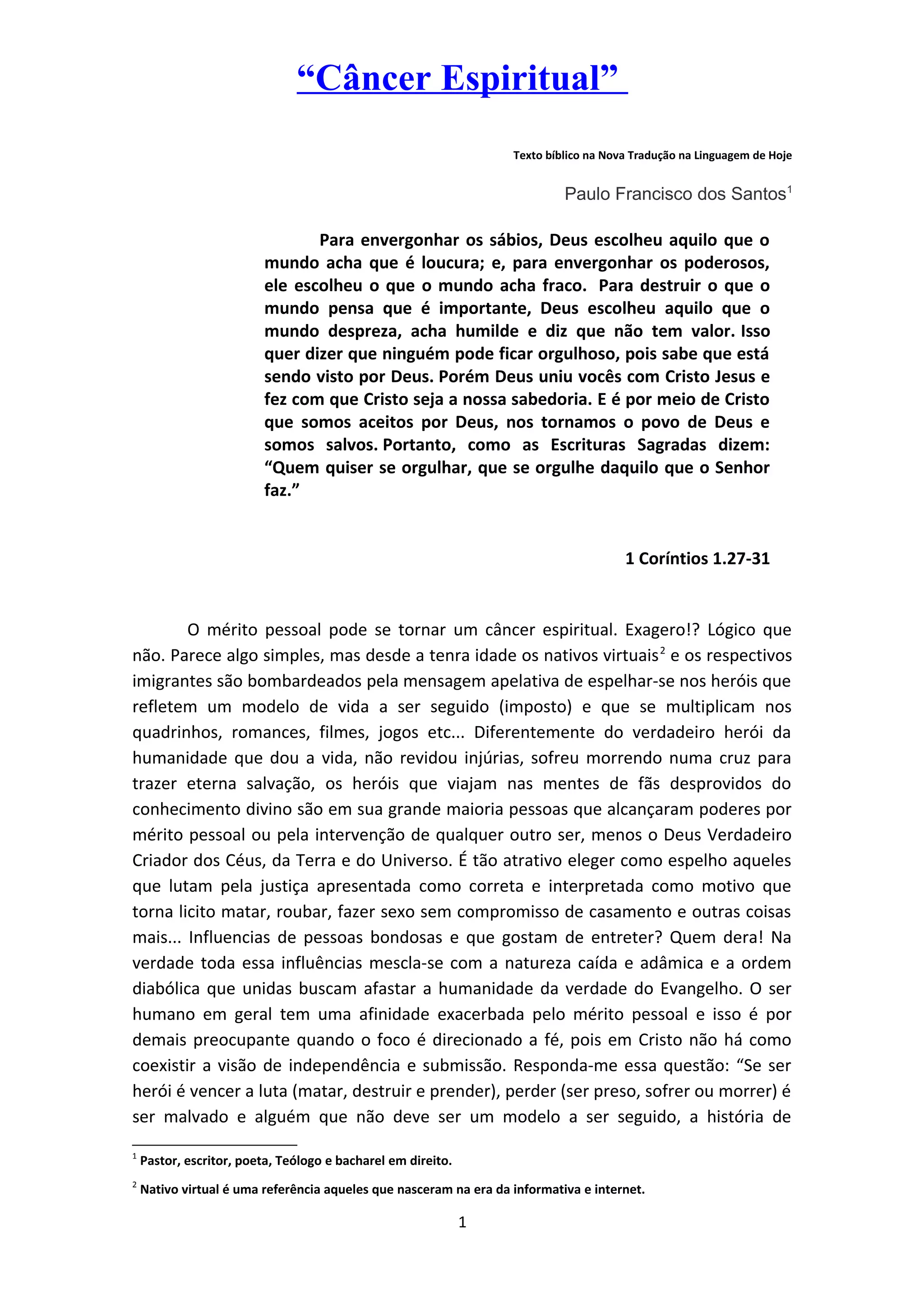 Este documento discute os perigos do "câncer espiritual" do orgulho e mérito pessoal. Ele argumenta que muitos heróis populares promovem valores contrários ao evangelho, como violência e sexualidade sem compromisso. Também destaca a importância de ensinar o evangelho desde cedo para proteger contra essa influência, e que a única coisa necessária para a salvação é crer em Cristo, não em obras próprias.