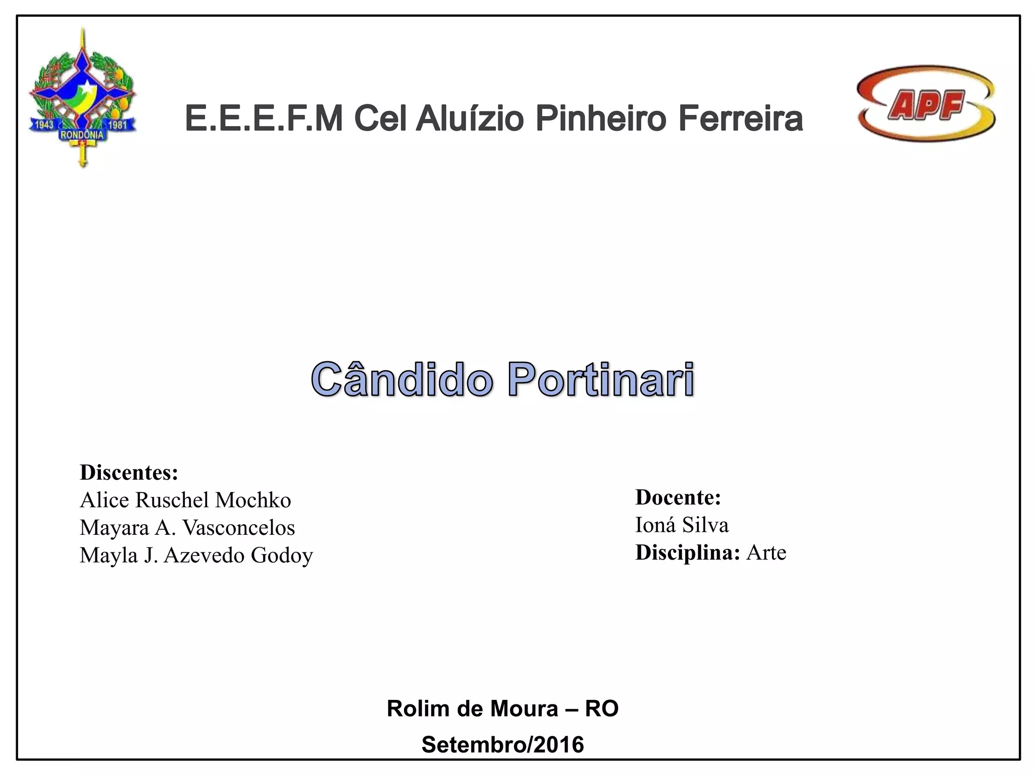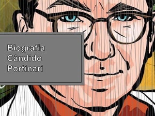 Candido Portinari teve influências artísticas desde a infância e estudou na Escola Nacional de Belas Artes no Rio de Janeiro. Suas obras retrataram questões sociais do Brasil e foram influenciadas pelo modernismo europeu. Portinari se dedicou a pinturas, afrescos e murais, denunciando problemas como a pobreza e a desigualdade social através de temas como trabalhadores rurais, favelas e retirantes.