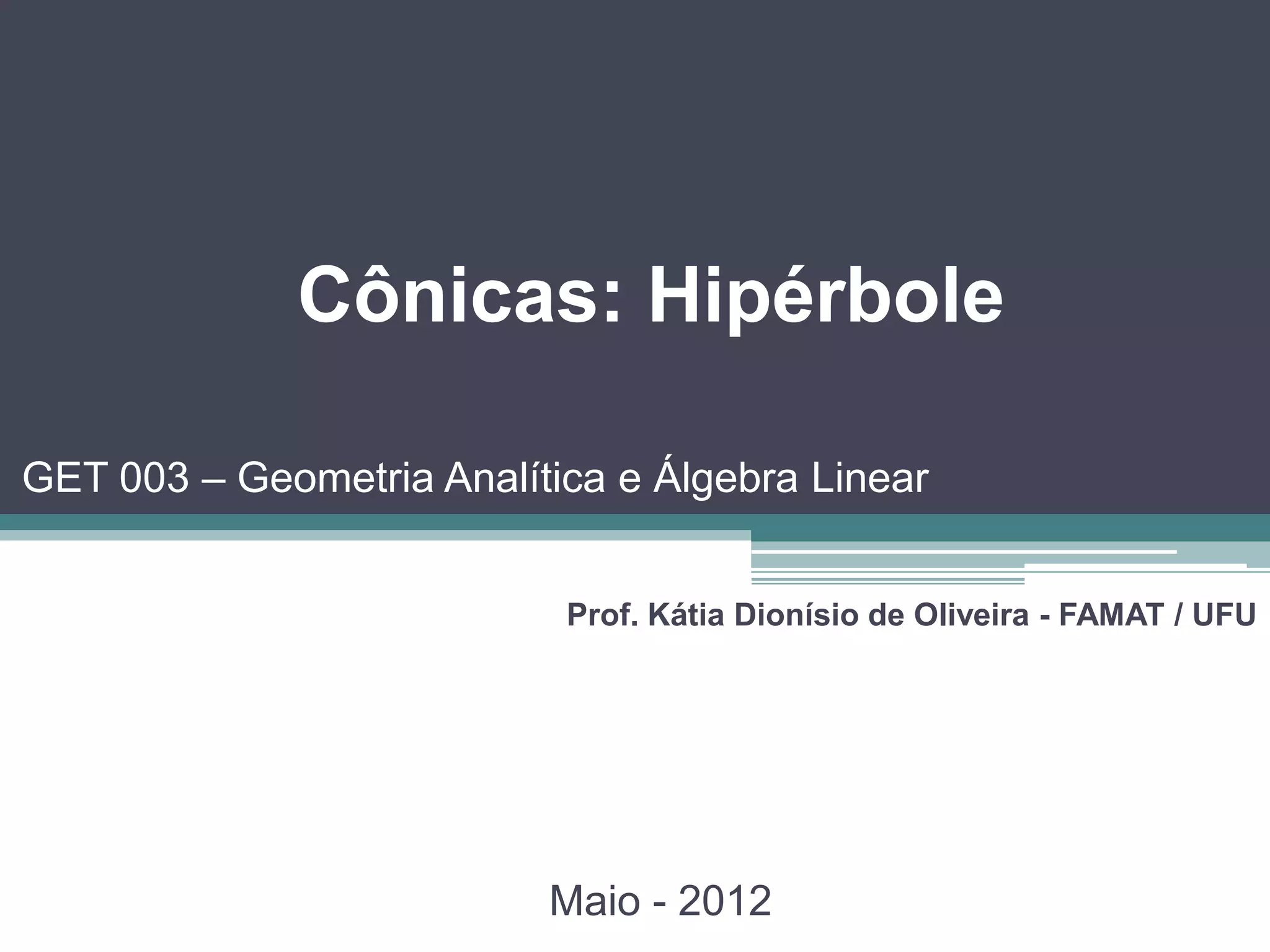 [1] O documento descreve as propriedades e elementos fundamentais da hipérbole, incluindo sua definição como o lugar geométrico dos pontos cuja diferença das distâncias aos focos é constante, [2] sua equação geral e reduzida quando o centro está na origem, e [3] as formas da equação quando o eixo principal está no eixo das abscissas ou ordenadas.