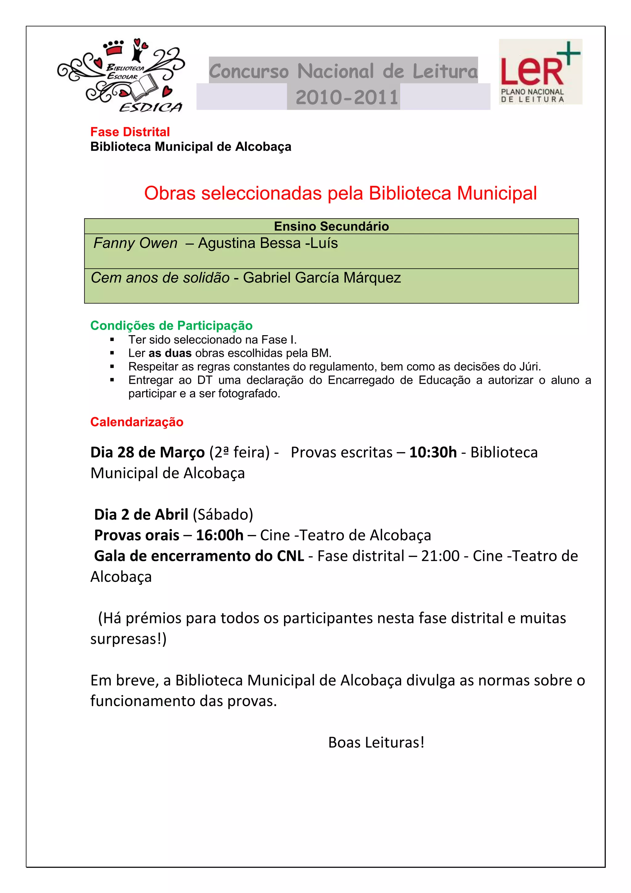 O documento anuncia a fase distrital do Concurso Nacional de Leitura para 2010-2011 na Biblioteca Municipal de Alcobaça. As obras selecionadas para os alunos do ensino secundário são "Fanny Owen – Agustina Bessa -Luís" e "Cem anos de solidão - Gabriel García Márquez". O cronograma inclui provas escritas em 28 de março e provas orais em 2 de abril, com uma gala de encerramento no Cine-Teatro de Alcobaça naquele dia.