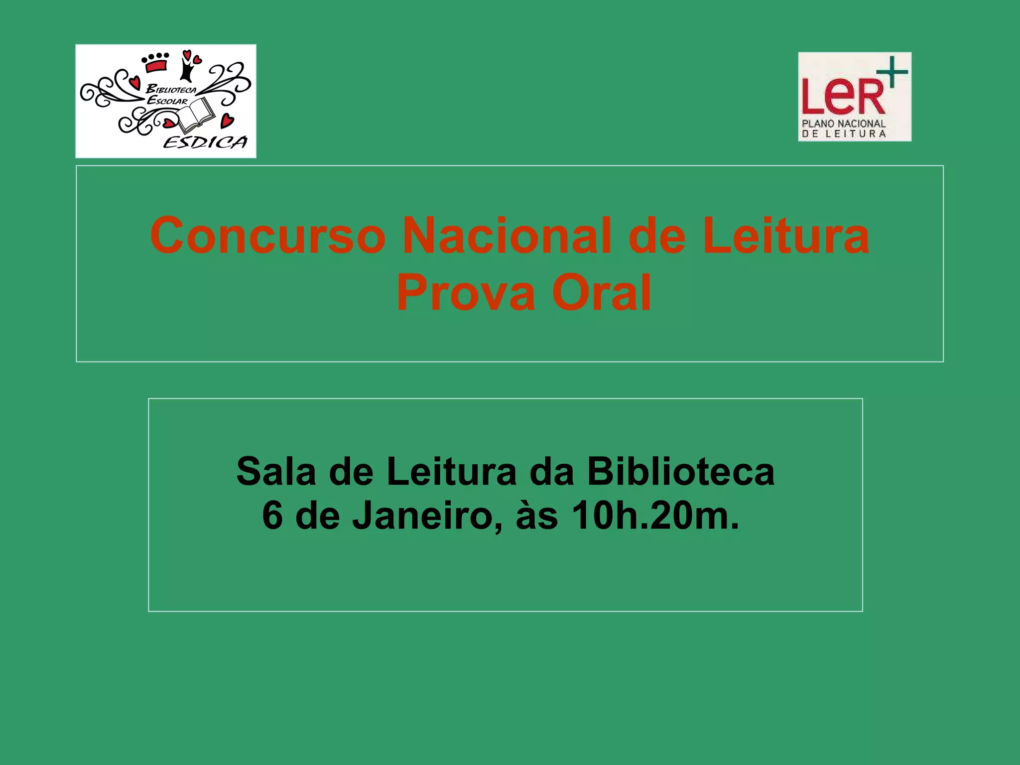 Uma prova oral para um concurso nacional de leitura será realizada na sala de leitura da biblioteca no dia 6 de janeiro às 10h20.