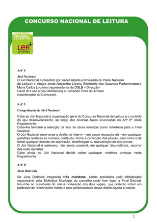 Este regulamento descreve as regras do Concurso Nacional de Leitura de 2009/2010, que tem como objetivo promover a leitura entre estudantes do ensino secundário e 3o ciclo do ensino básico. O concurso será realizado em três fases: provas nas escolas, finais distritais e final nacional transmitida pela RTP. As escolas devem inscrever seus alunos entre outubro de 2009 e janeiro de 2010.