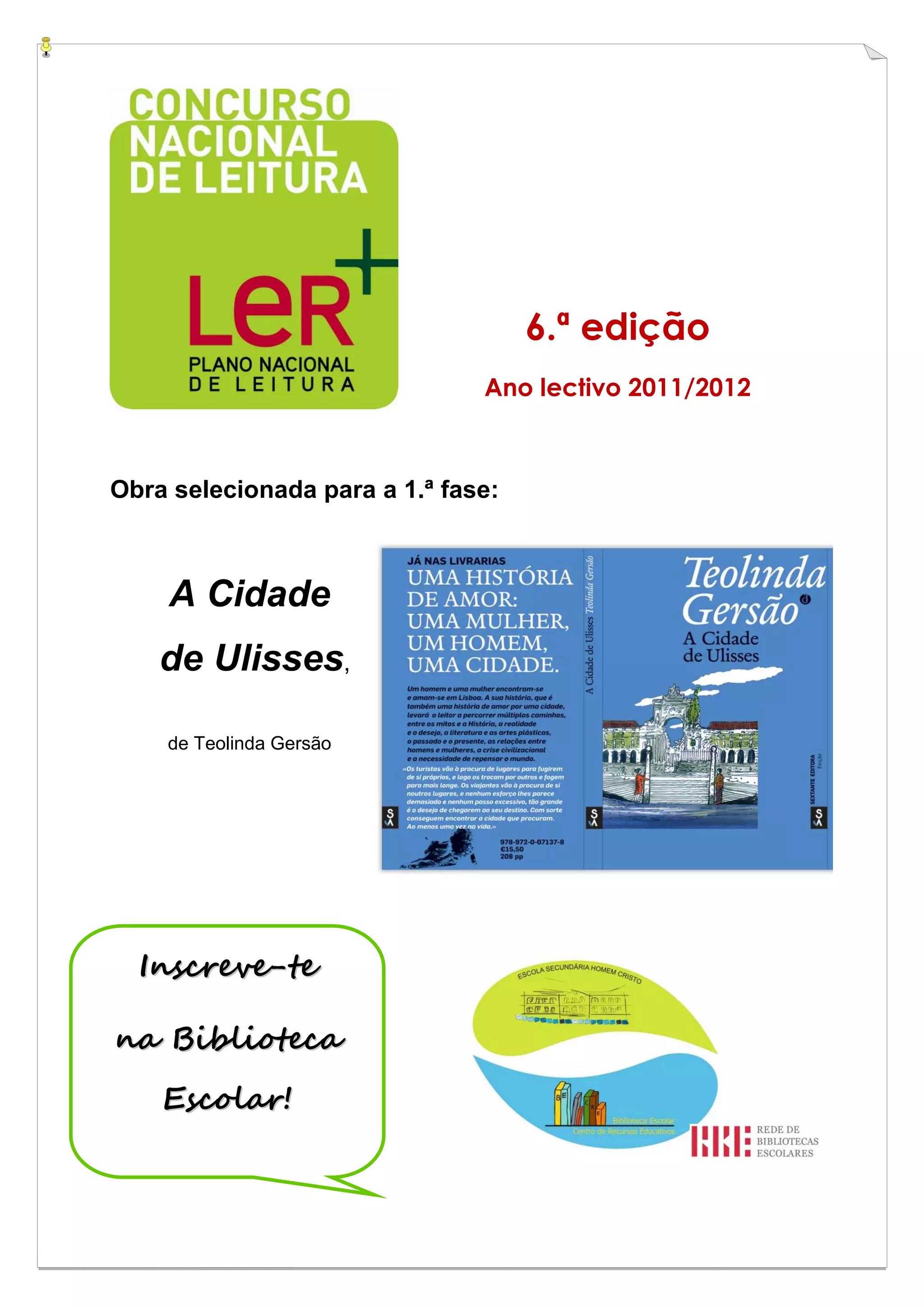 Este documento descreve o regulamento do Concurso Nacional de Leitura para o ano lectivo de 2011/2012. O concurso visa estimular a leitura entre alunos e avaliar a leitura da obra "A Cidade de Ulisses", de Teolinda Gersão. O concurso acontecerá em três fases, com provas na escola em janeiro, provas distritais até abril e provas finais em maio.