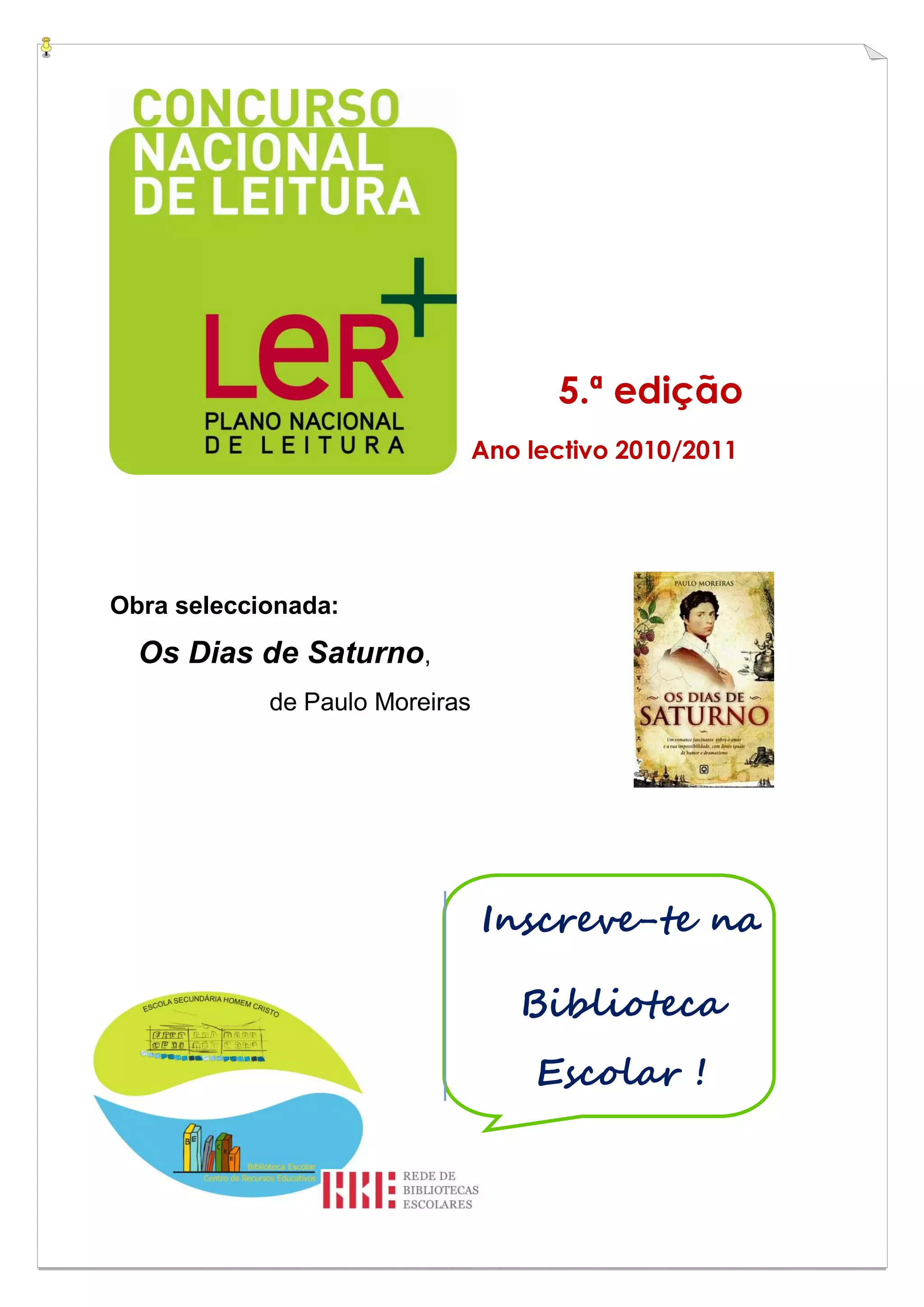 Este documento descreve o regulamento da primeira fase do Concurso Nacional de Leitura para o ano lectivo de 2010/2011 na escola. A obra seleccionada é "Os Dias de Saturno" de Paulo Moreiras. As inscrições podem ser feitas até 16 de Dezembro e a prova será a 5 de Janeiro. Os três primeiros classificados passarão à fase distrital.