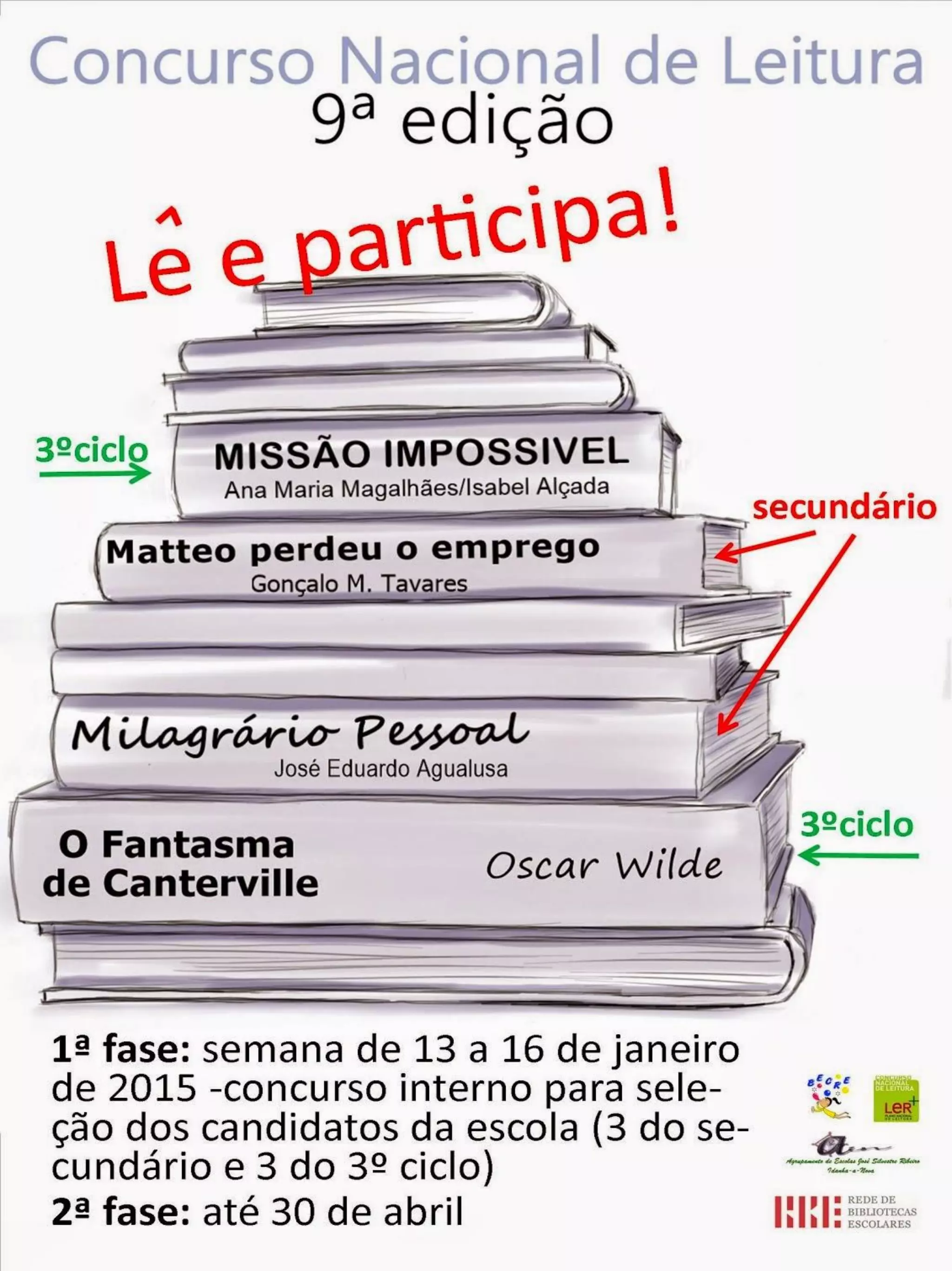 O documento apresenta um calendário de provas para o 1o ano do ensino secundário, incluindo datas e horários para provas do 7o, 8o e 9o ano em diferentes dias da semana sobre obras literárias como "O Fantasma de Canterville" de Oscar Wilde e "Missão Impossível" de Ana Maria Magalhães.