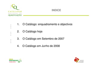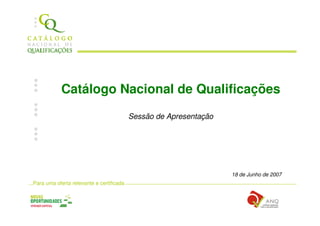 Este documento descreve o desenvolvimento planejado do Catálogo Nacional de Qualificações de Portugal. Resume que o catálogo será atualizado em setembro de 2007 para incluir novas qualificações e referenciais de formação, e em junho de 2008 será constituído por referenciais de qualificação únicos baseados em competências.